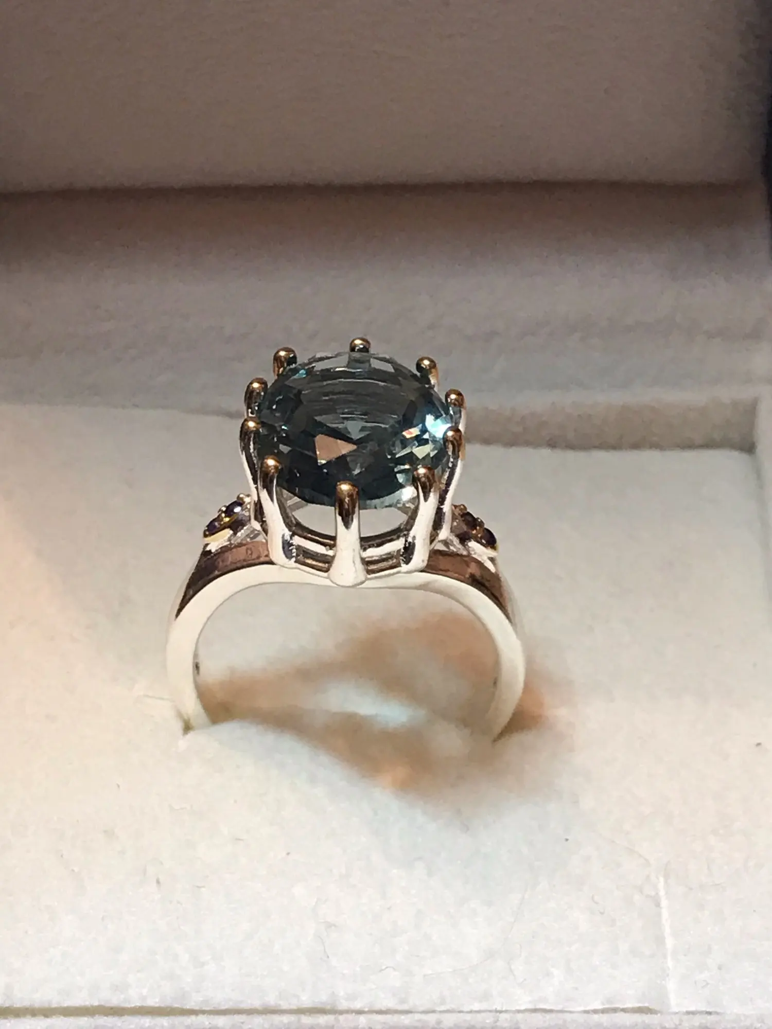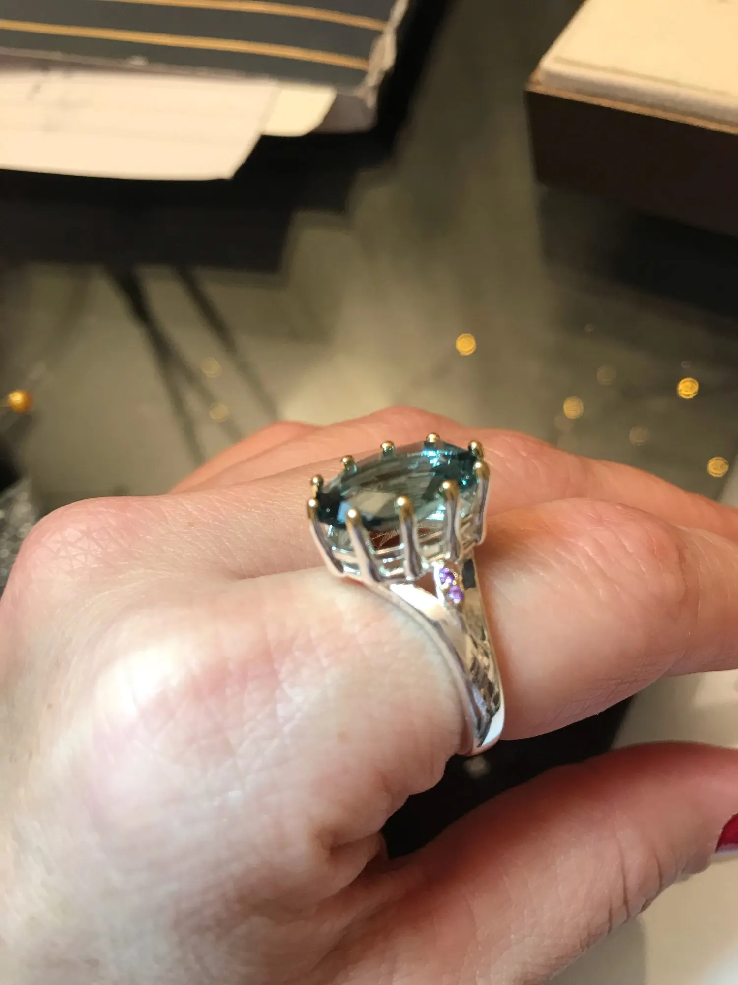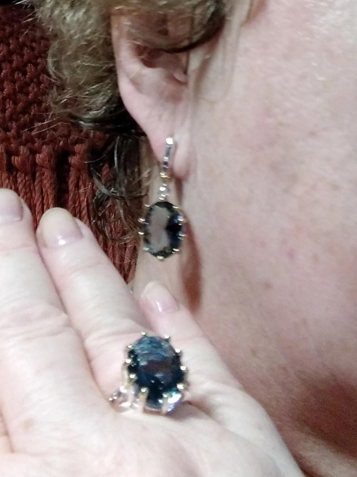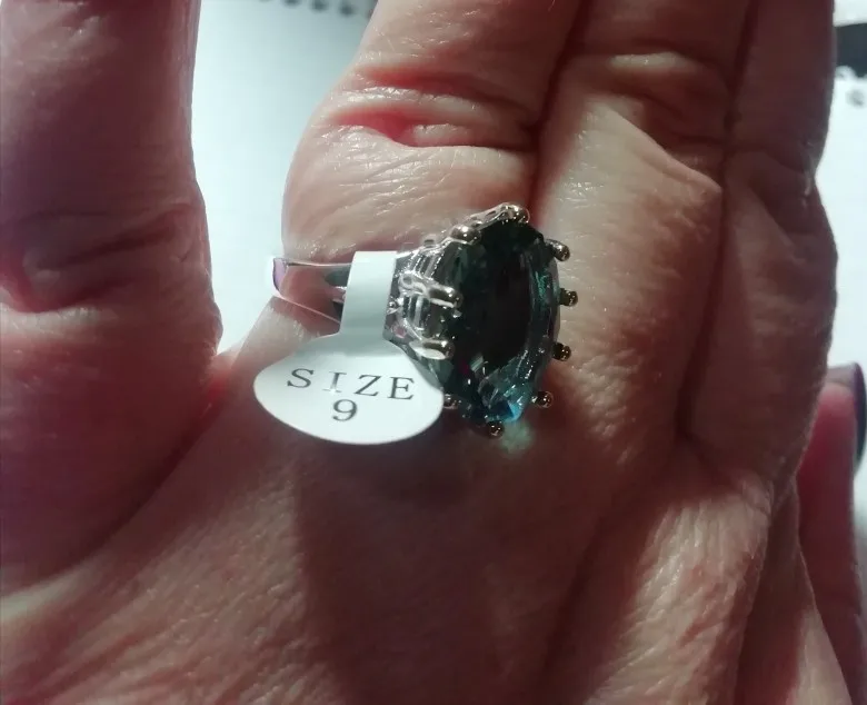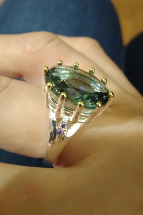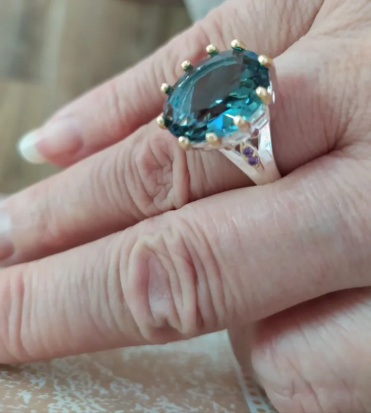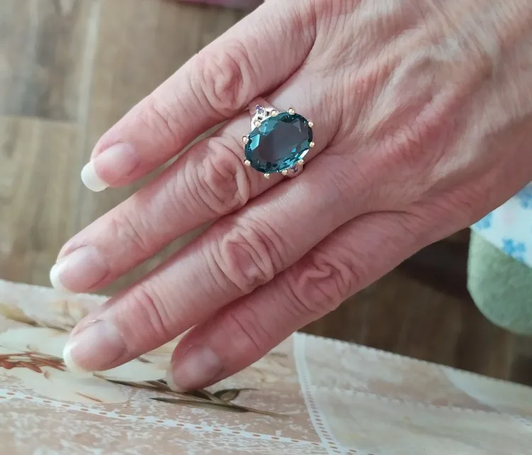 Брала кольцо в комплекте с серьгами. Мне всё в нём понравилось. Цвет камня необычный, прозрачный, красиво сверкает. Размер не сильно большой, но и немаленькие. Само кольцо немножко маломерит,примерно на полразмера.