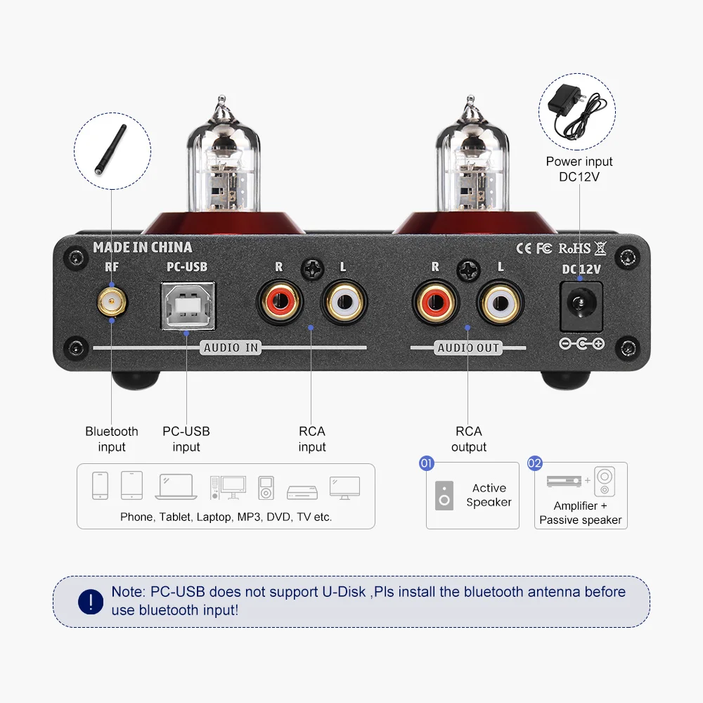 1. Это трубный усилитель, который должен быть подключен к усилителю или активным динамикам, не может управлять пассивным динамиком напрямую. И это не фонокорректор, не может работать с вертушками.2. Для наушников выход предварительного, стерео RCA выход будет автоматически отключается при подключении наушников к своему 3,5 мм выход.