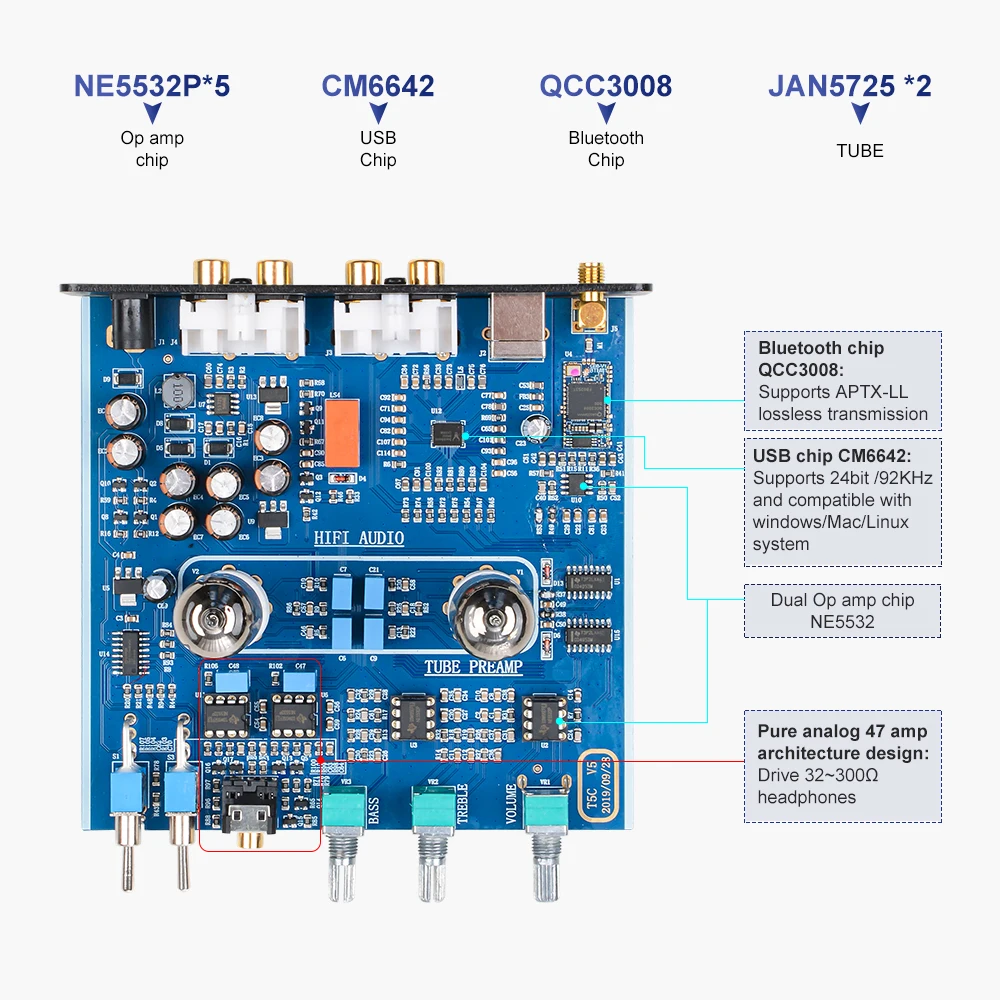 Зрелый контур и высококачественные компоненты: разумная и лаконичная компоновка, меньше проводки и меньше шума. Чип QCC3008 Bluetooth поддерживает APTX-LL передачу без потерь, чип декодирования CM6642 поддерживает 24 бит/192 кГц и совместим с системой Windows/Mac/Linux, 5 * NE5532 op amp обеспечивает лучшую производительность и широкое звуковое поле, классический аналоговый 47 наушники amp architecture могут управлять наушниками 32-300Ω.Несколько аудиовходов и выходов: Поддержка Bluetooth 5,0/USB (поддержка OTG) /стерео входы RCA и с кнопкой выбора входа, может быть идеально совместима с большинством аудиоустройств, таких как телефон, компьютер, телевизор, cd-проигрыватель, ЦАП и так далее. С стерео RCA и 3,5 мм выход для наушников, легко пользоваться функцией подачи Хай-Фай музыки и по-разному.Идеальный дизайн и привлекательный внешний вид: с высоким и басовым контролем, чтобы наслаждаться более гладким и нежным звуком. Модный корпус из черного алюминиевого сплава с ЧПУ в сочетании с теплым светильник из винтажной трубки выглядит потрясающе, очень подходит для клиентов, которые добиваются прекрасного слухового и визуального удовольствия.