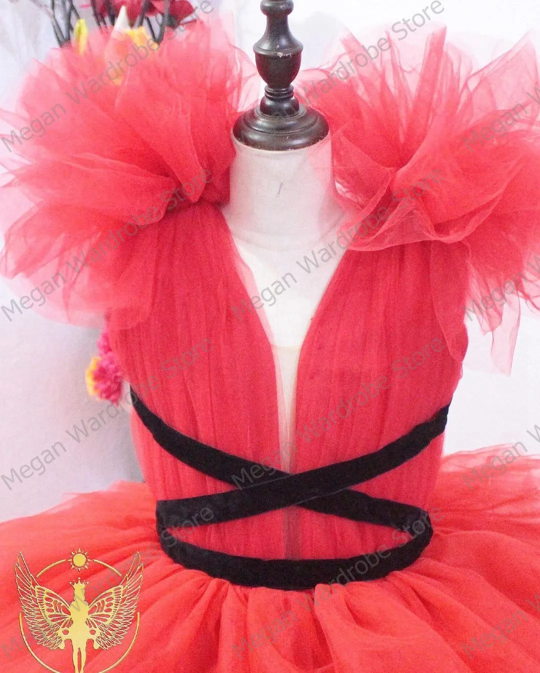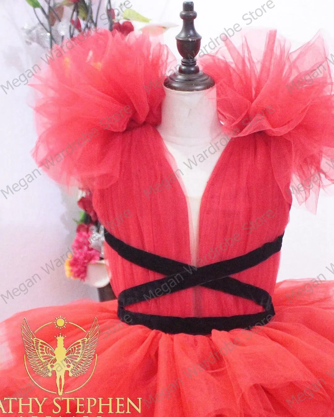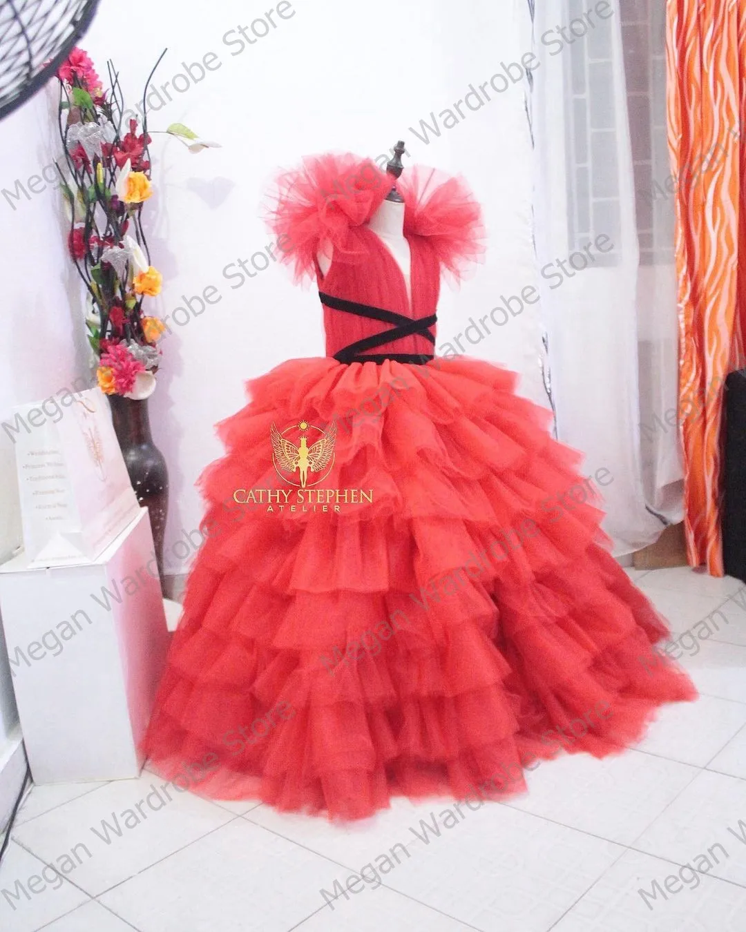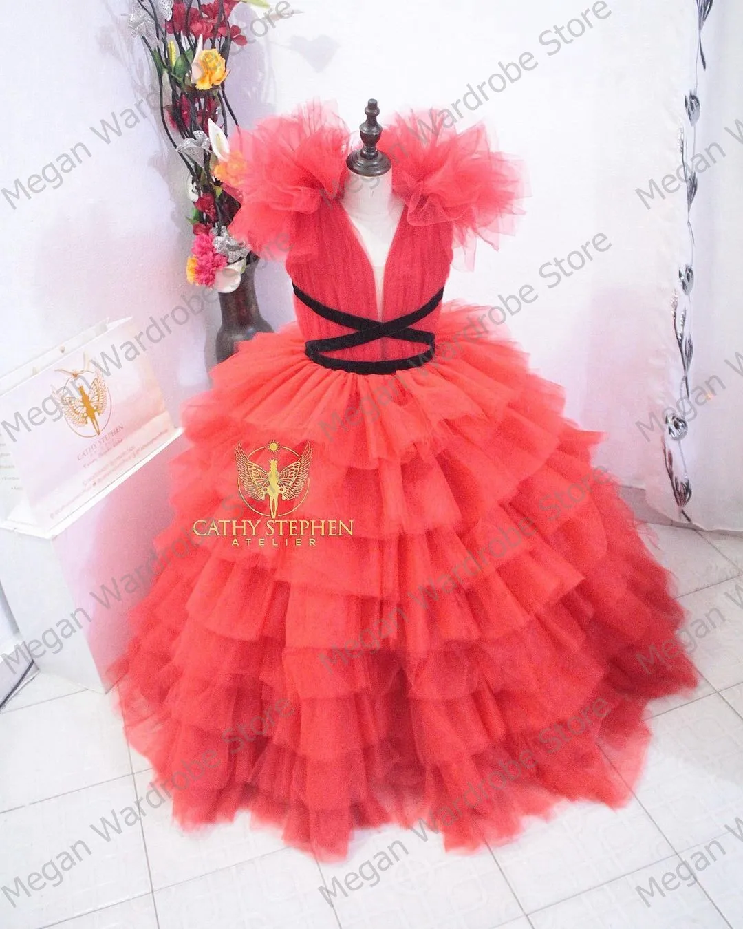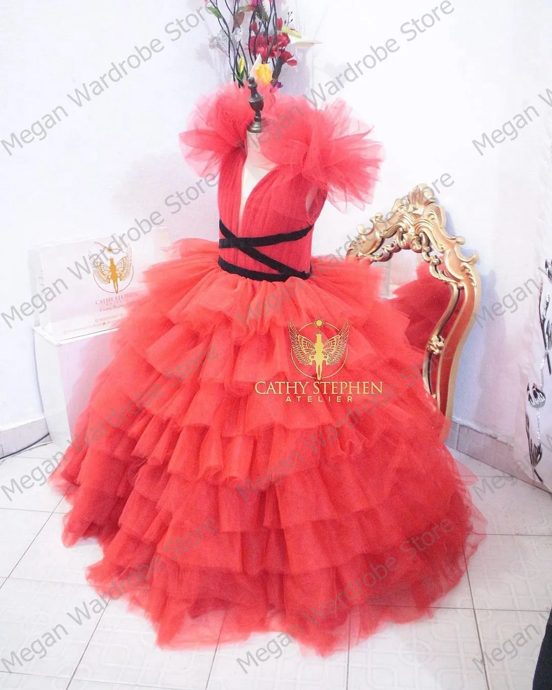 Очень пышные красные платья с оборками и цветочным принтом для девушек, Длинные официальные платья из тюля для свадьбы, дня рождения, вечерние платья, индивидуальный пошив