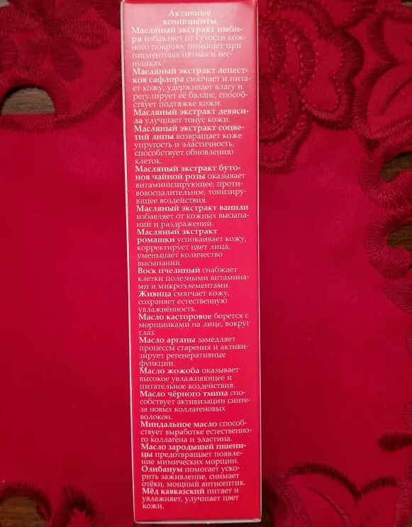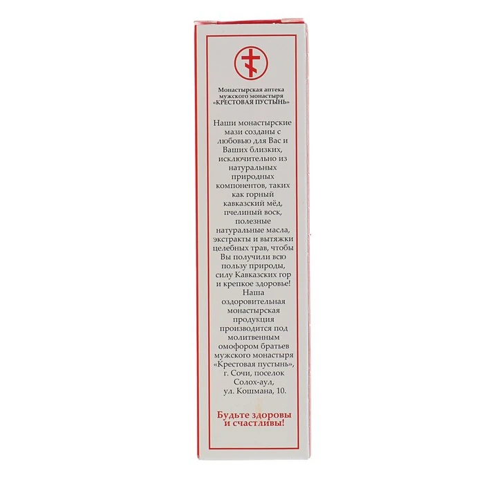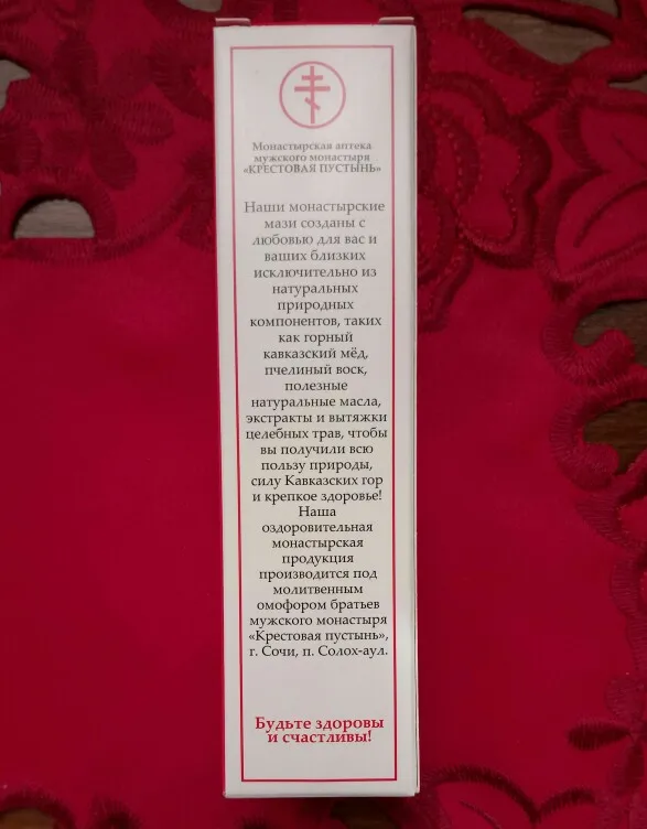 Ароматная, очень приятная, лечебная мазь! Полностью соответствует заявленным характеристикам и фото. Отличное качество: натуральный состав, медовый аромат, маслянистая текстура, смягчает кожу, устраняет шелушение. Мазь упакована в коробочку с подробным описанием, в комплекте - аннотация. Доставка очень быстрая. Благодарю!