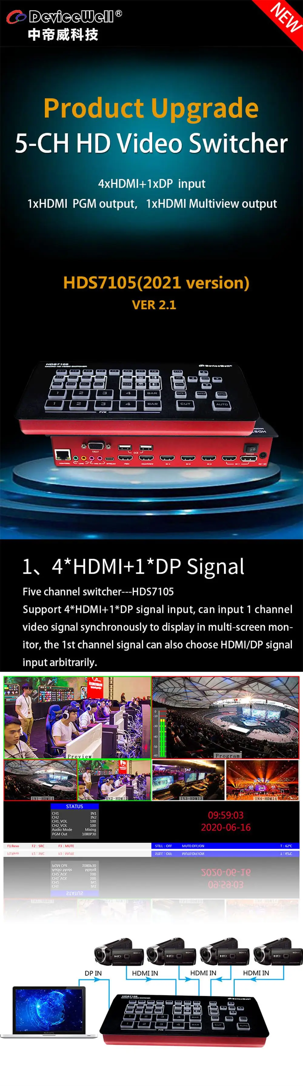 Видеопереключатель DeviceWell HDS7105-V21 hds7105 _ 2021, новая версия, 5-канальный видеопереключатель, 4 * HDMI 1 * DP переключатель для потока видео