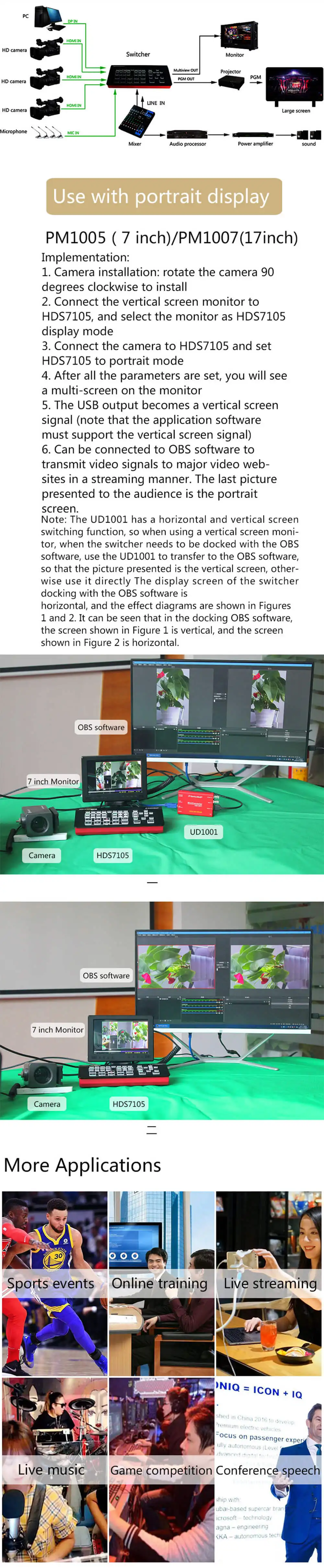 HDS7105 версия:◆ Портативный интегрированный дизайн◆ Металлический фюзеляж, высокая прочность и вес светильник◆ Встроенная клавиатура управленияПоддержка до 4 входов HDMI + 1 DP◆ Два стерео микрофона◆ 1 комплект аудиовхода lotus seat◆ 1 линейный выход◆ Поддержка следующих аудио и функций смешивания◆ Поддержка HDMI audio de-embedding◆ Выход PGM: 2 HDMI◆ Выход с несколькими изображениями: 1 HDMI◆ Поддержка микс/выцветание и другие спецэффекты переключения◆ Поддержка резки и автоматического переключения спецэффектов◆ Поддержка TallyHDS7105S (базовая версия):◆ Портативный интегрированный дизайн◆ Металлический фюзеляж, высокая прочность и вес светильник◆ Встроенная клавиатура управления◆ Поддержка 4 * HDMI + 1 * DP вход◆ Поддерживает выход 2 * HDMI, включая один выход прямого эфира (PGM) и один выход мультипросмотра◆ Поддерживает 2 стерео микрофона◆ 1 Набор линейный вход/выход поддерживается◆ Поддержка однокнопочного переключения выходного разрешения◆ Поддержка функции отключения звука одной кнопкой◆ Поддержка следующих аудио и функций смешивания◆ Поддержка HDMI audio de-embedding◆ Поддержка микс/выцветание и другие спецэффекты переключения◆ Поддержка резки и автоматического переключения спецэффектов◆ Поддержка сетевого управления и обновления◆ Поддержка входного напряжения DC12V Сравнение 7105 и 7105S (базовая версия):1. 7105S не имеют высокий интерфейс2. 7105S не имеют входную и выходную группу аудиопорта Lotus Head3. 7105S уменьшает один HDMI PGM выходной интерфейс4. 7105S уменьшает интерфейс USB и интерфейс push-flow (Примечание: порт push-flow на HDS7105 является резервным интерфейсом и не имеет функции)5.HDS7105S добавляет функцию отключения звука одной кнопкой Поддержка резки, поддержка автоматического переключения спецэффектовПоддержка дистанционного управления Tally / NetworkNO.2 4 * HDMI + 1 * DP5-канальный коммутатор-HDS7105 поддержка 4 * HDMI + 1 * DP вход сигнала, может выводить 4 видеоСигналы одновременно на мультиэкранный монитор для отображения, четвертый сигнал также можетПроизвольный выбор входного сигнала HDMI / DP.№3 силиконовые кнопки5-канальный коммутатор -- HDS7105 Devicewell является первым силиконовым переключателем ключей это пятиканальный