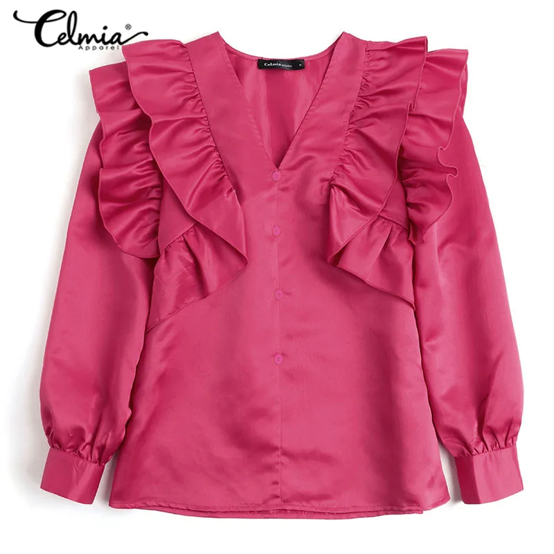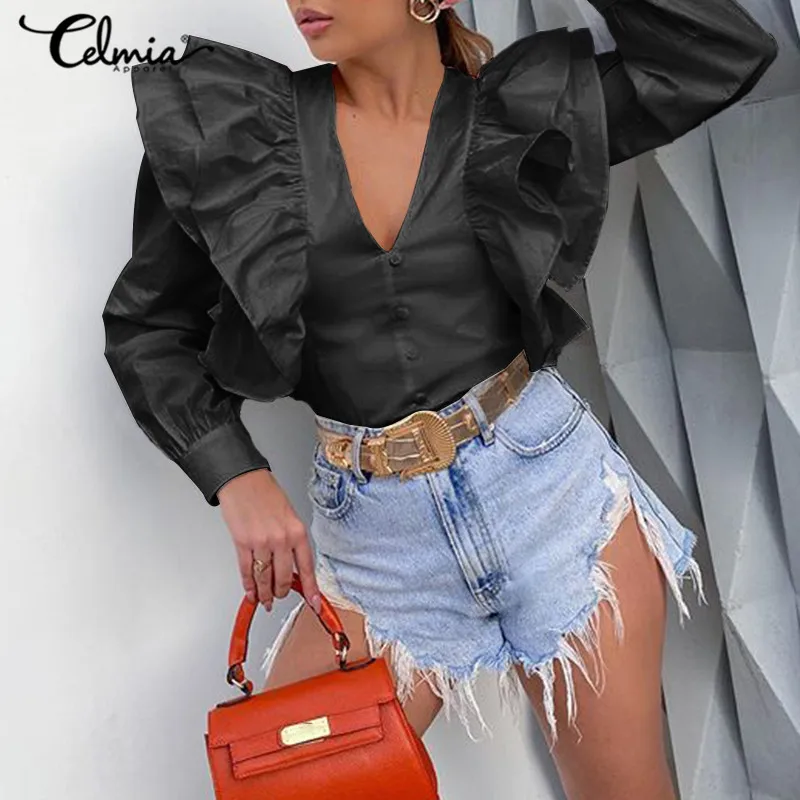 Celmia 2021 модные блузки с оборками, Женская пикантная рубашка с глубоким V-образным вырезом, Повседневная однотонная праздвечерние чная блузка, топ-туника на пуговицах