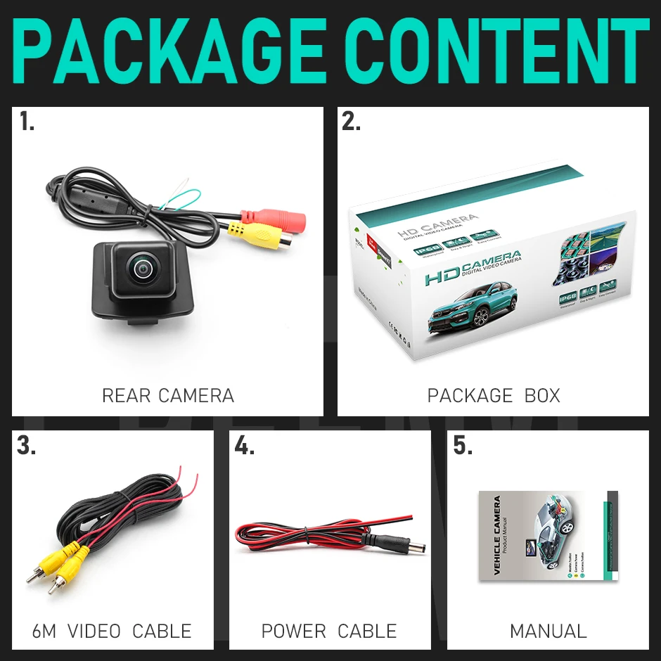 1. Камера заднего вида2 посылка вочная коробка3. Видеокабель (6 м)4. Кабель питания5. Руководство пользователя
