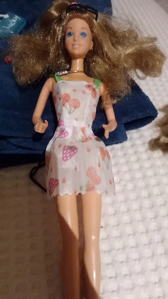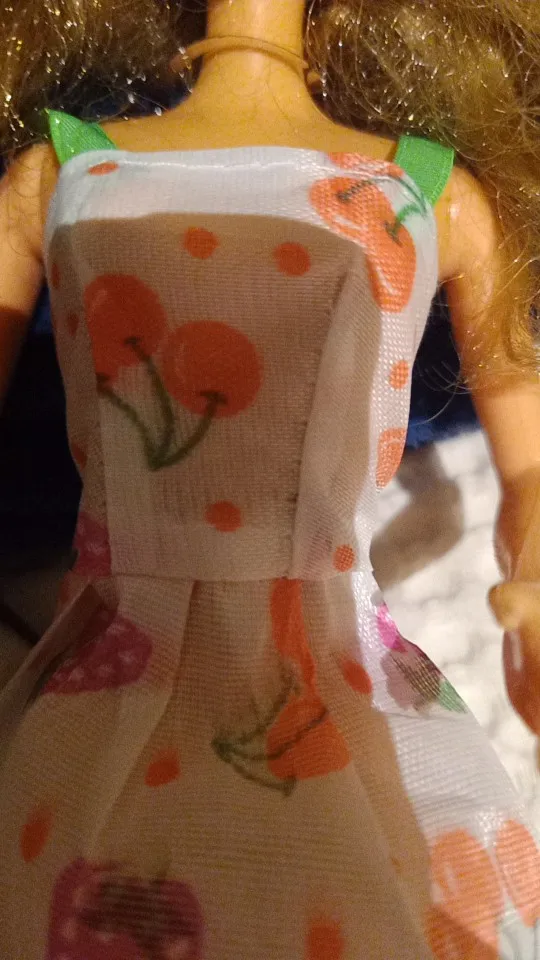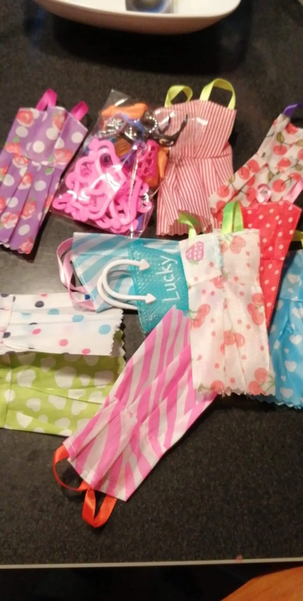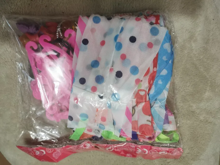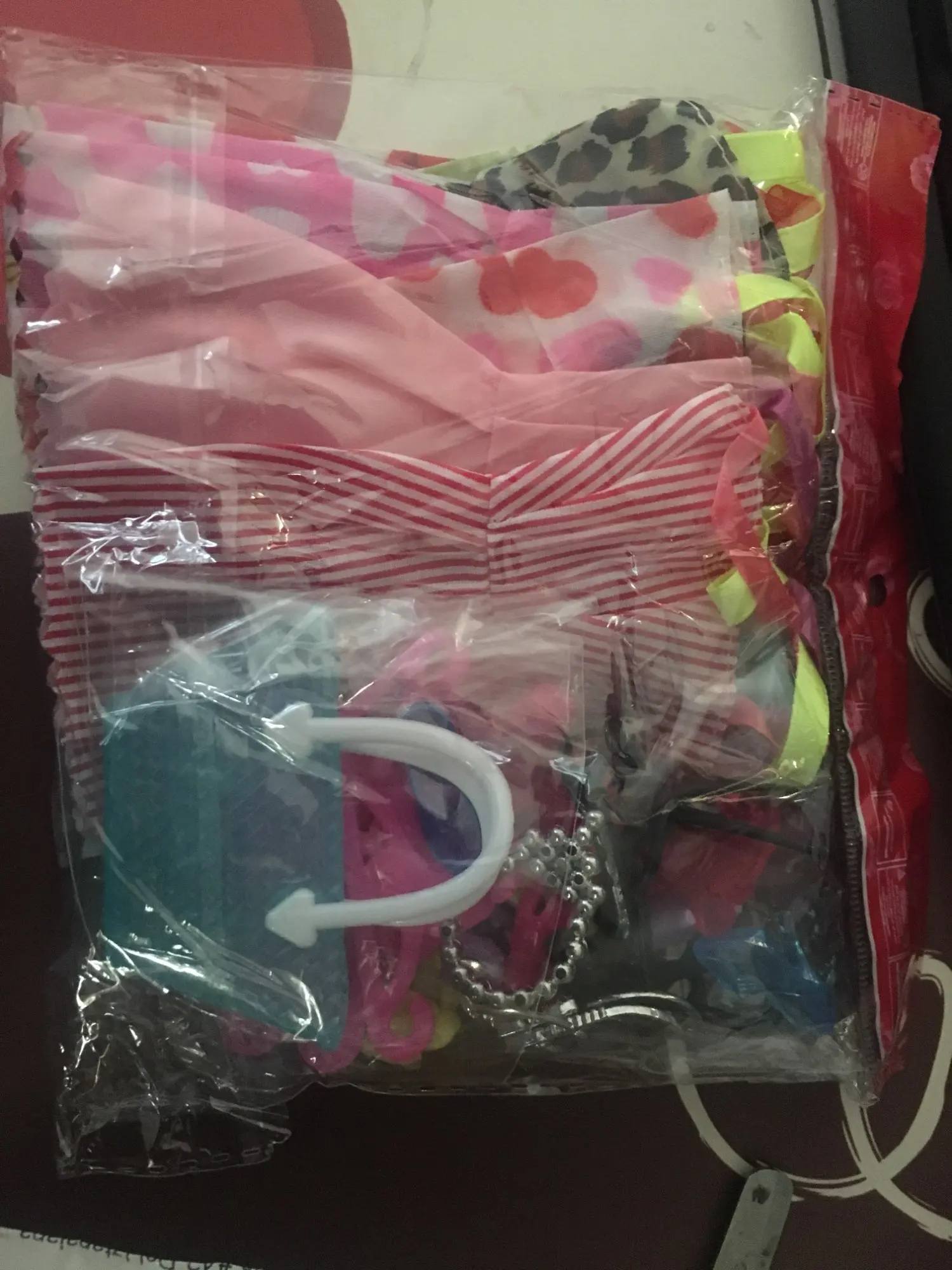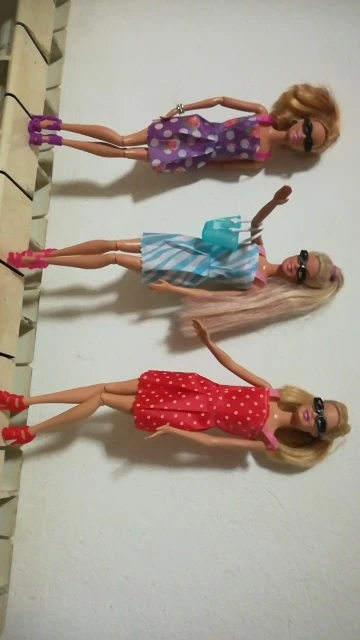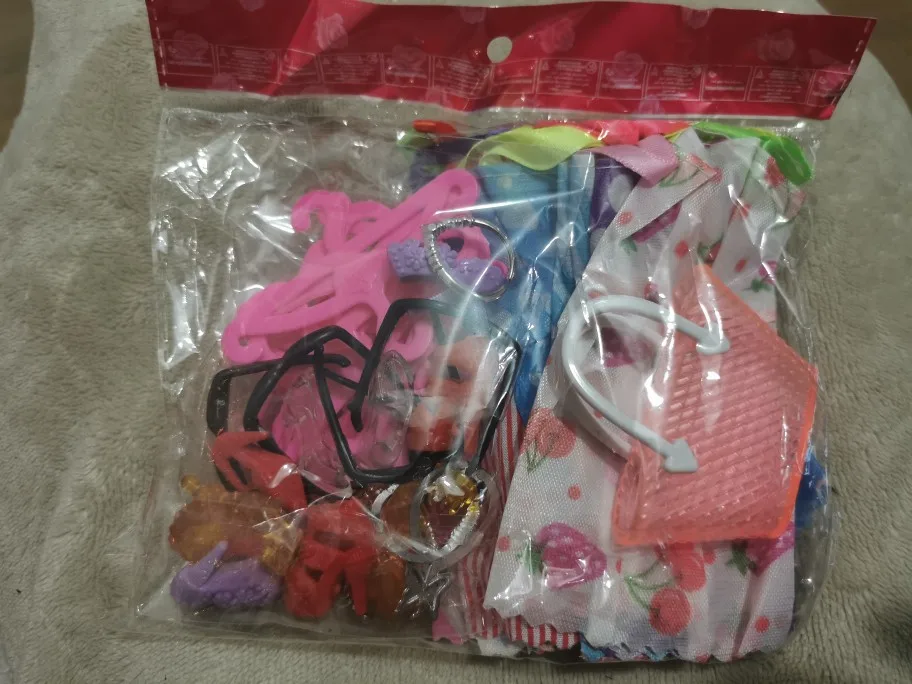 Los vestidos son plástico, no me lo esperaba así para nada y los accesorios repetidos... 6 gafas me han venido iguales. Y solo un bolsito