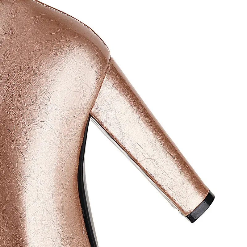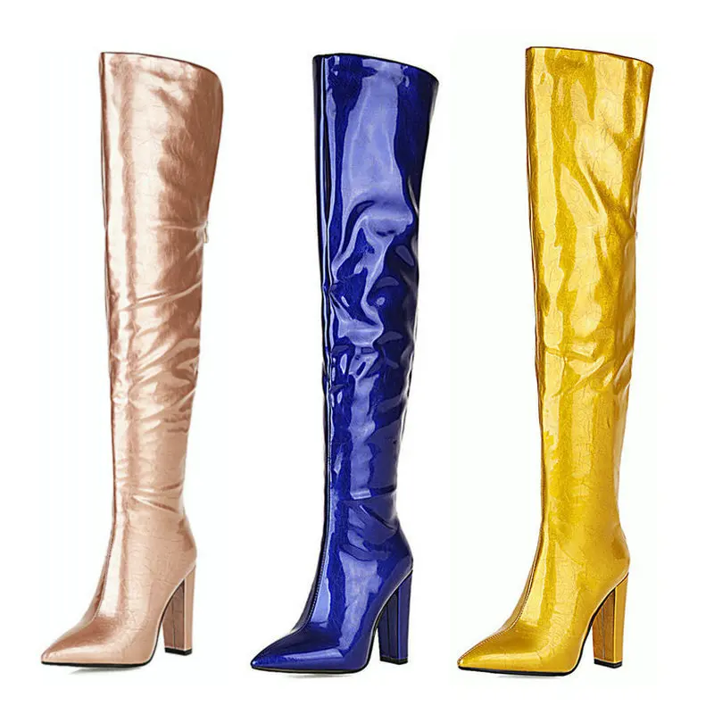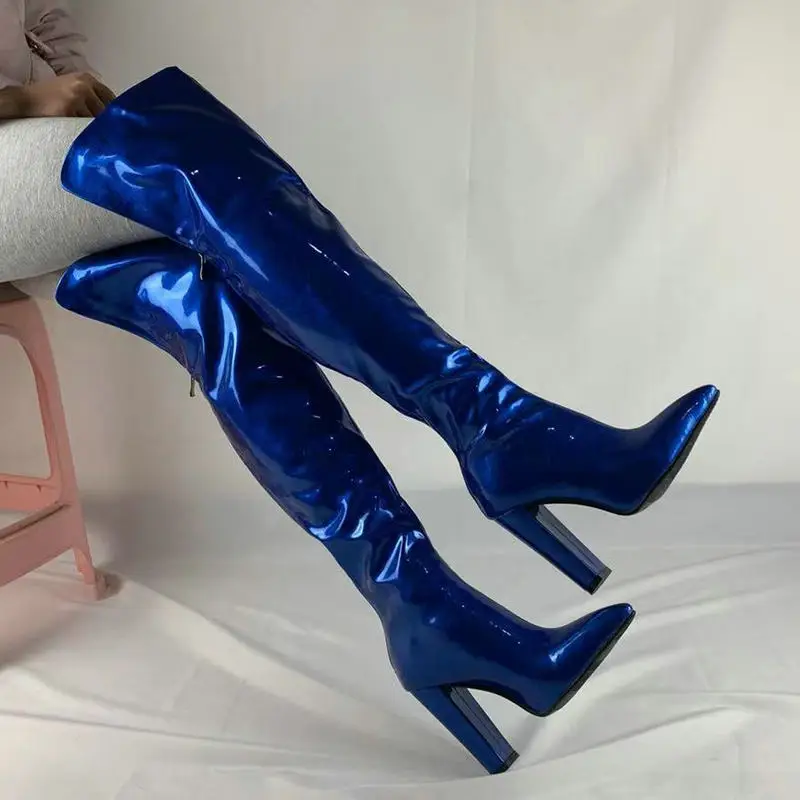 Новинка 2021, женские сапоги выше колена из лакированной искусственной кожи, женские сапоги на высоком устойчивом каблуке, обувь на молнии сзади с острым носком, женская обувь 34-43