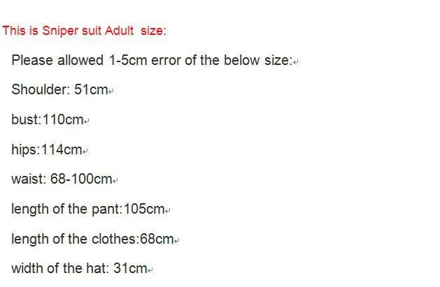 Birçok boyut vard✮ve boyunuma göre ininiz boyutu seçebilirsiniz. RU iyi kaliteyi satın almak için En iyi fiyat, kсчитырское!Камуфляжный костюм JUNLGE 5 adet GHILLIE YOWIE keskin nişancı taktik kamuflaj elbise ghillieШартназвание:Ренк: камуфляж wooldlandМатериал: полиэстерНабор включает: 1 пантолон, 1 цекет, 1 шт. ayrı kaput, 1 шт. тюфек-обертка, 1 шт.Бойту:Омуз: 21 дюймКОЛ: 29 дюймовДиаметр цепочки: 31 дюймДлина пантолона: 43 дюймаBel boyutu: высококачественный, 48 дюймовWОзеллик:-Yepyeni ve kaliteli-Sert ve высококачественный полиэстер-Taşıma için для налаживания отношений с семьей и семьей-Летние футболки для девочек с круглым вырезом-Ceket üzerindeki Poppers, цельнокроеное карандашное полотенце-Kamuflaj kıyafetnihaiКомплектация: для мальчиков, чехим, чёрлгинка, сталкинг, пейнтбол, страйкбол, гёзетим, ябан хайхайлайт fotoğraf, хоромлимпийский, vb.Пакет içeri:1 х пантолон1 цекет1 х высококачественный базирующий1 x тюфек Сарма1 х саклама çant✮