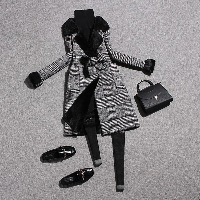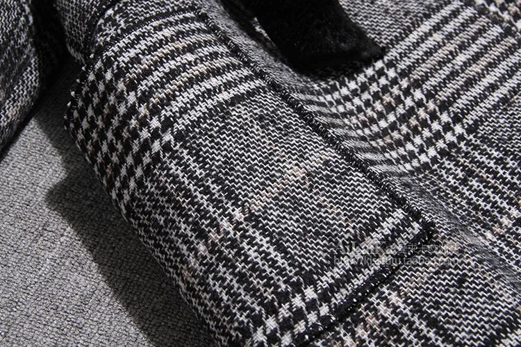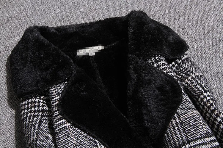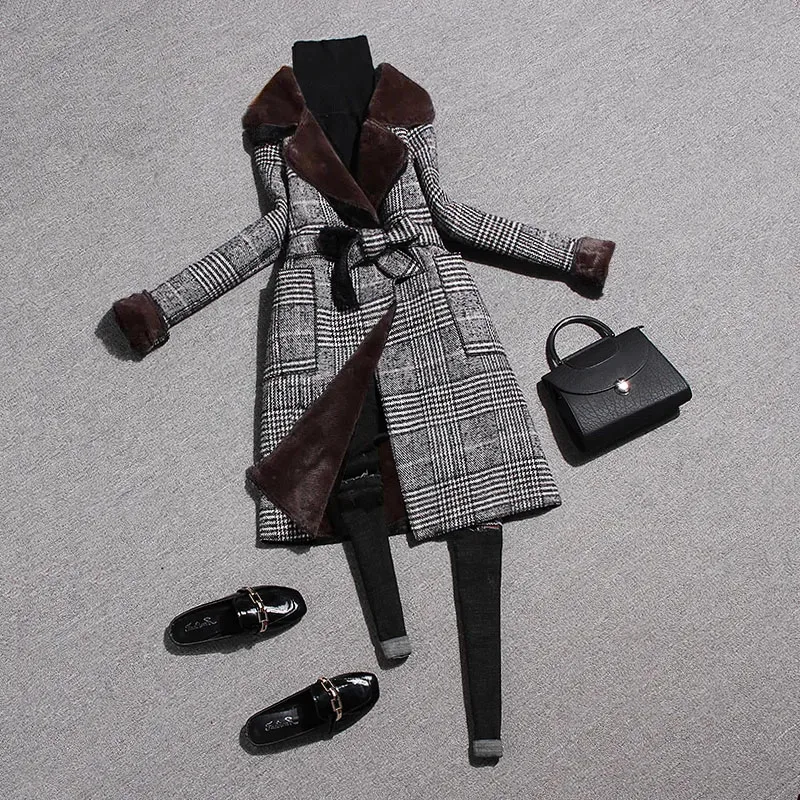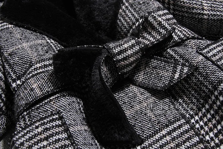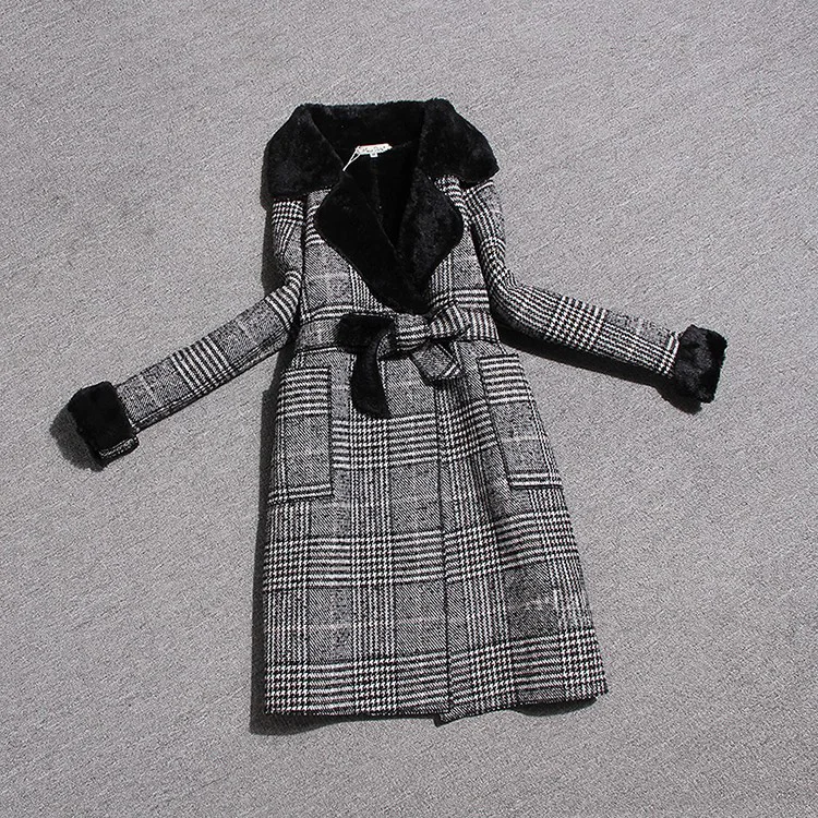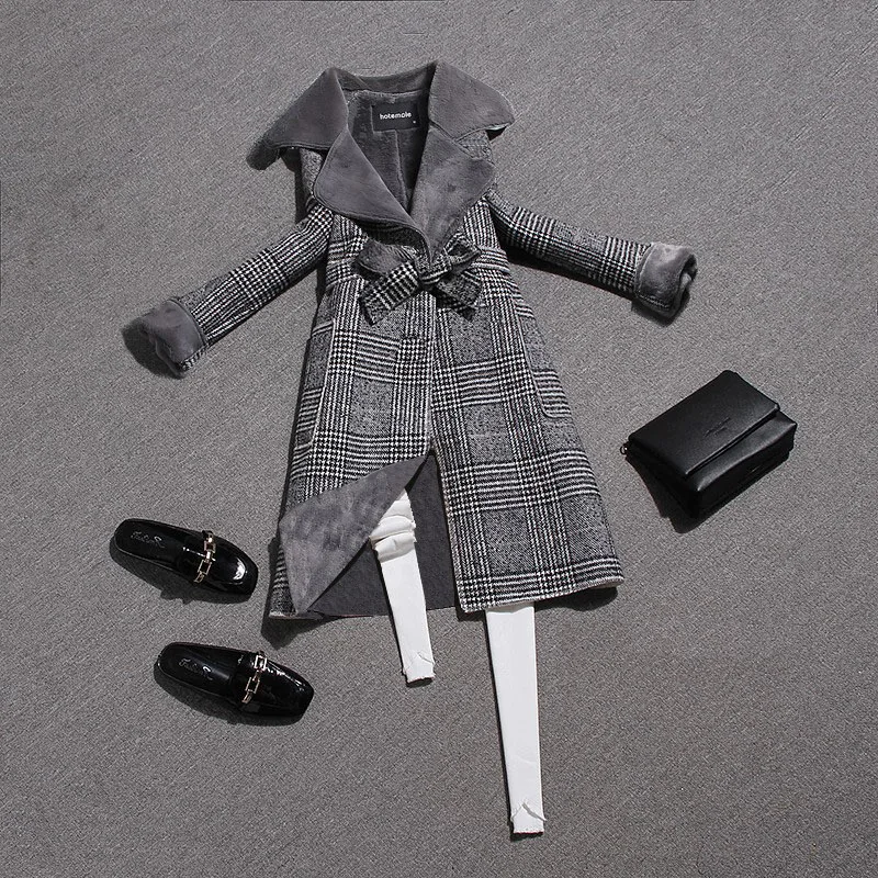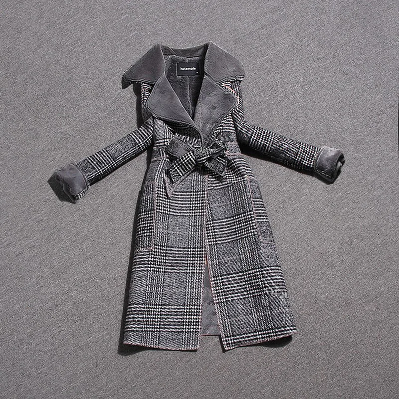 Шерстяное пальто JK288 с бархатным воротником и лацканами, повседневное шерстяное пальто средней длины в клетку, с поясом, на зиму