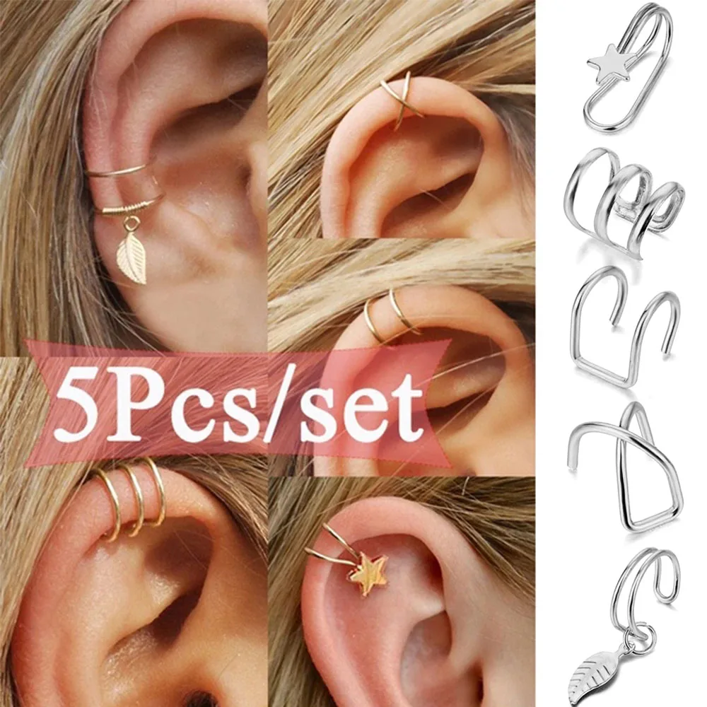 Женские серьги-клипсы с листьями и звездами, набор из 5 шт.компл., без Имитация пирсинга, серьги, Надеваемые На ушной хрящ, Набор шпилек для ушей