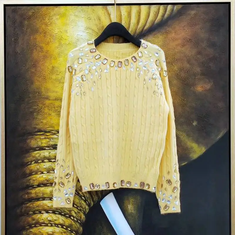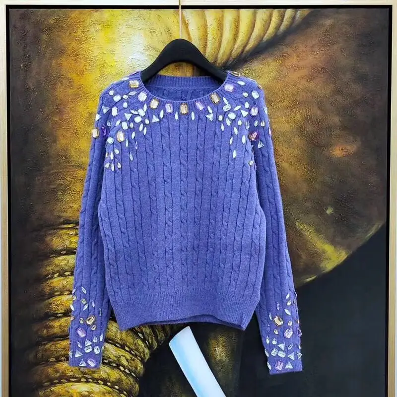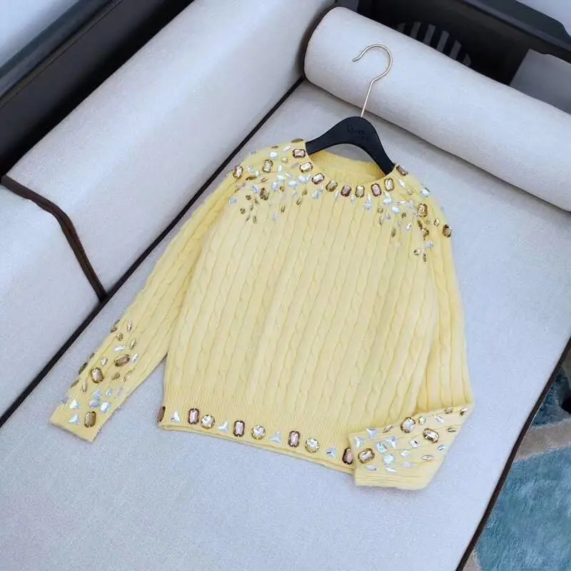 Роскошный подиумный пуловер с бриллиантами, высокое качество, Осень-зима, винтажный вязаный пуловер, элегантный твист, фиолетовый, желтый, джемпер с длинными рукавами