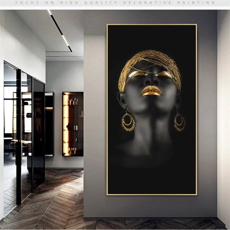 Черные женские с Золотая повязка на голову из плотной ткани настенные картины Плакаты и принты в африканском стиле девушка Wall Art Холст Картины без рамки