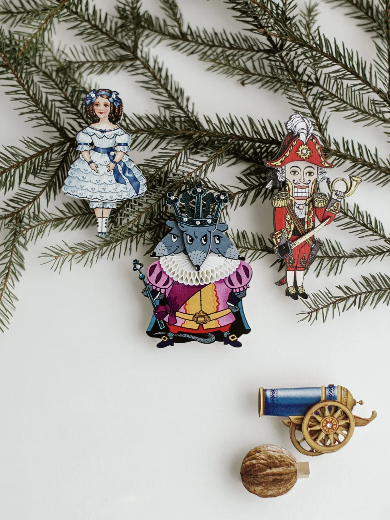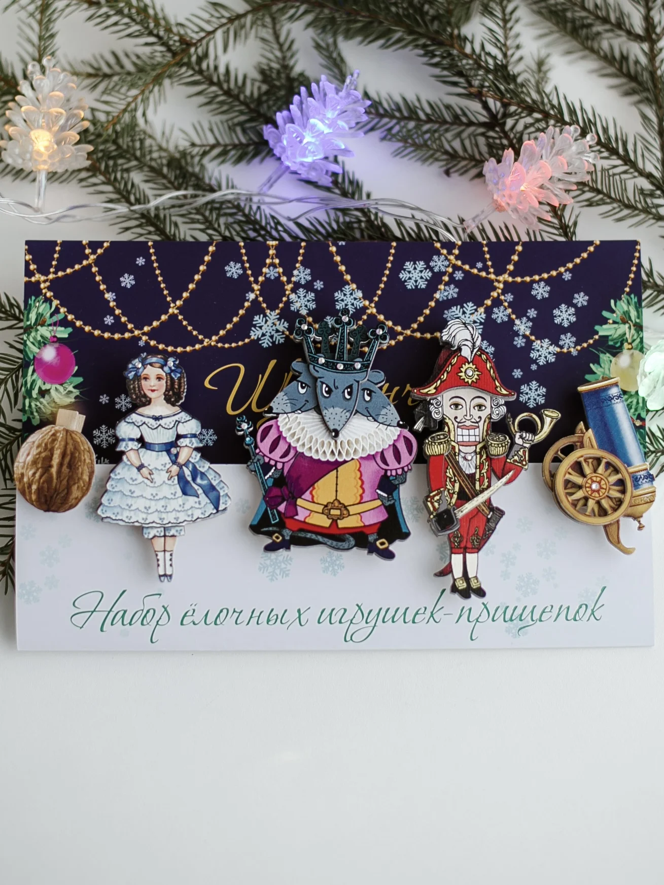 В наборе из 3 елочных игрушек на прищепке:1) Мари (размер 85*35)2) Щелкунчик (размер 85*50)3) Мышиный король (размер 85*65 мм)
