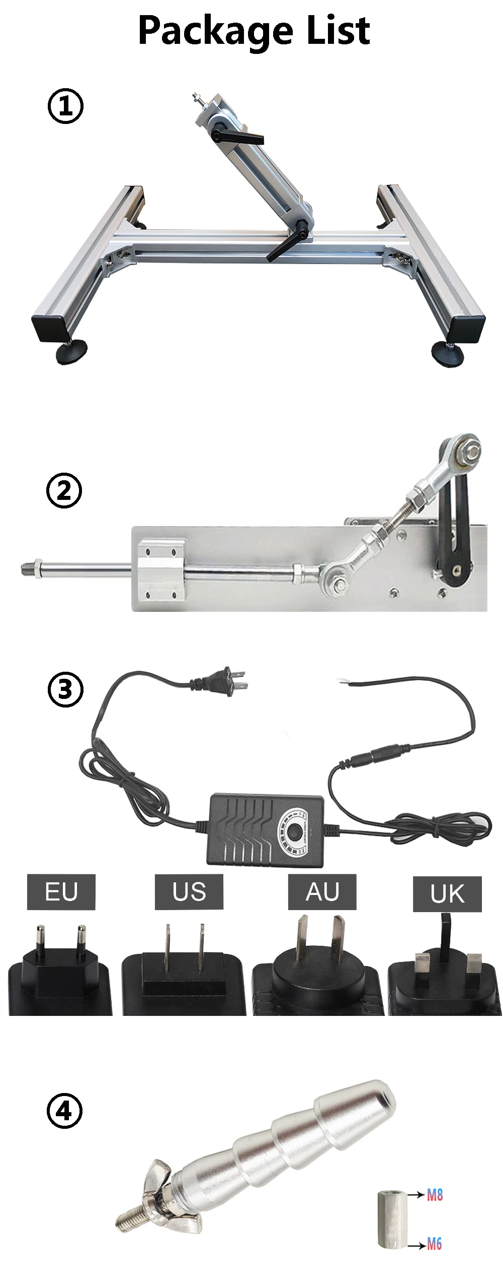 1) поршневой линейный двигатель 2) блок питания с регулятором скорости 3) комплекты подставок 4) концевой разъем