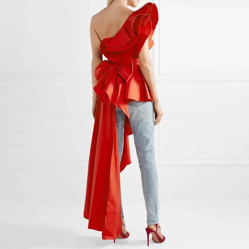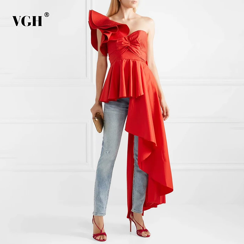 Женская Асимметричная рубашка VGH, элегантная рубашка с косым воротником, рукавом-бабочкой и оборками, ажурная рубашка с высокой талией и рюшами, в женском стиле