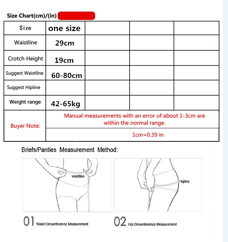 Размер: один размер Материал: нейлон и спандекс Упаковка: 1 шт. с полипропиленовым пакетом Размер: Ткани из разных материалов имеют разную эластичность, поэтому разные стили одного размера могут немного отличаться в размере плитки. Спасибо за понимание. Соображения по уходу: Ручная стирка теплой водой около 30 градусов. Не замачивайте слишком долго. Нижнее белье плотно прилегающее и Интимная одежда, в которой легко размножаются бактерии. Для нашего здоровья рекомендуется менять его каждые шесть месяцев