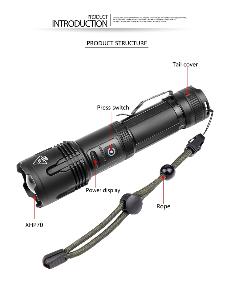 Модель: 1700Лампа-светильник: XHP99Размер изделия: 17,8*4,3*3,5 смВес нетто: 217 гМатериал: алюминиевый сплавПереключатель: нажмите переключательАккумулятор: 1*18650/1*26650 (не входит в комплект)Способ зарядки: micro USB зарядкаШестерня: 5 передач s: сильный светильник-средний Светильник-низкий светильник-вспышка-SOSМетод масштабирования: телескопический зумУровень водонепроницаемости: водонепроницаемыйХарактеристики: вход и выход, с держателем ручки, с хвостовой веревкойСветильник индикатора: индикатор заряда батареи
