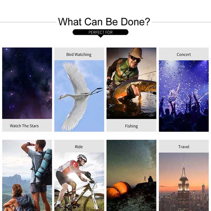 Путешествия, спорт на открытом воздухе, с видом использования.Раздел недалеко от фокусное расстояние до 0,5 м, с близкого расстояния взгляд на развитие является достаточно преимущество.Компактный, легкий и может переносить в любое время.Подходит для любителей красивой природы, просмотра птиц, занятий спортом и т. д.Прочный материал из алюминиевого сплава также подходит для суровых условий.