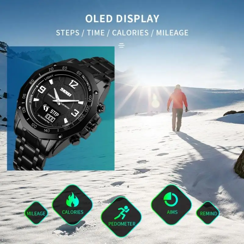 Характеристики: Отображение даты/3 времени/Недели/Компас/шагомер/калории/пробег/данные/темометр/Расстояние/Секундомер/Обратный отсчет/oled-дисплей/ 12/24 часовые часы/Полный календарь/ударопрочный/измерение температуры/Секундомер/отображение недели/Водонепроницаемость/Компас/хронограф/несколько часовых поясов/светящиеся стрелки