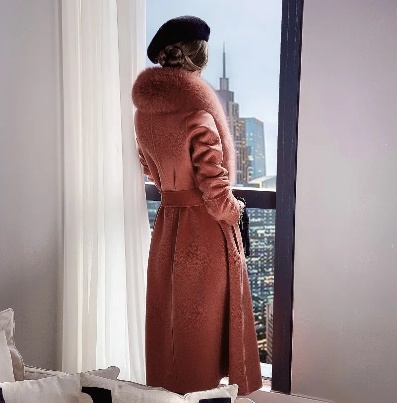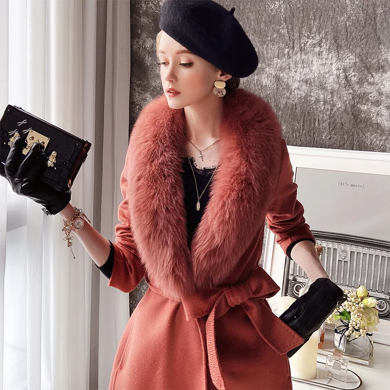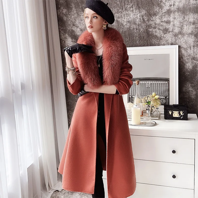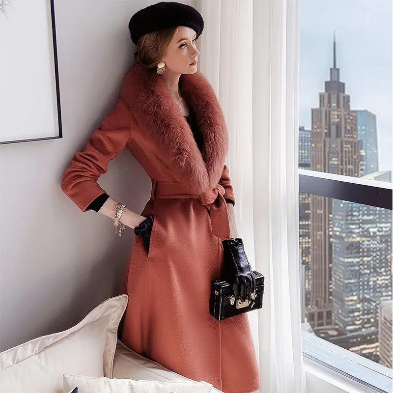 Dabuwawa элегантное однотонное Женское пальто из натуральной овечьей шерсти с воротником из лисьего меха и V-образным вырезом, длинное пальто с поясом, женская мягкая зимняя куртка DT1DLN027