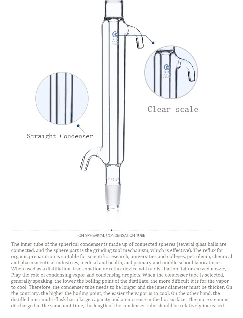 Перед использованием Вымойте трубку прямого конденсатора. Подключите увеличенный порт верхнего конца конденсаторной трубки к ветровой трубке колбы с проложенной резиновой пробкой. Добавьте вещество, которое нужно дистиллировать В колбу дистилляции, а затем подключите источник воды с резиновой трубкой на входе воды (нижний порт) конденсаторной трубки, И подключите другую резиновую трубку к верхнему порту, чтобы облегчить поток охлаждающих сточных вод. Нижний конец конденсаторной трубки соединен с приемной бутылкой, так что дистиллятор может вытекать вертикально. После установки всех устройств закрепите их на полке. Сначала Включите Охлаждающую воду, а затем Нагрейте дистиллят до кипения. Пар вдоль внутренней трубки соответствует стенке трубы, охлаждаемой охлаждающей водой, а затем конденсируется в капельки и поступает в принимающую бутылку для получения чистого вещества.
