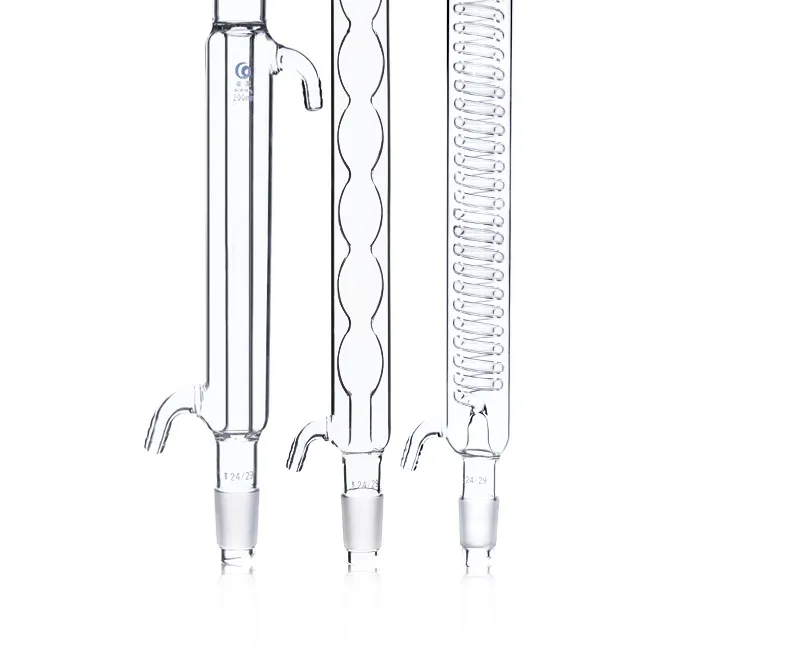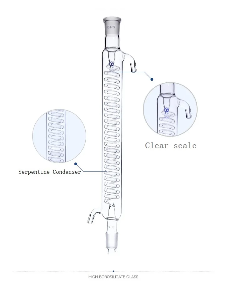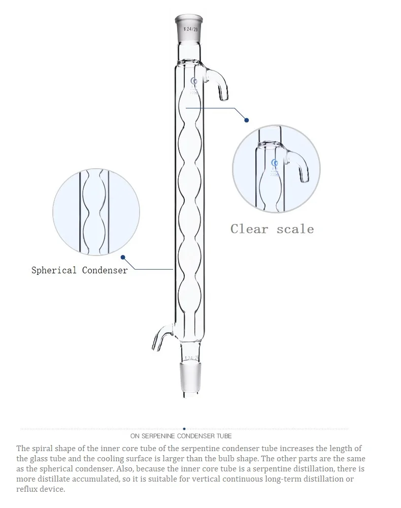 Спиральная форма внутренней сердцевины трубки конденсатора серпантина увеличивает длину стеклянной трубки и поверхность охлаждения больше, чем форма лампы. Другие части такие же, как и Сферический конденсатор. Кроме того, поскольку внутренняя основная трубка является дистилляцией серпантина, накапливается больше дистиллятов, поэтому она подходит для вертикальной непрерывной длительной дистилляции или рефлюксного устройства.