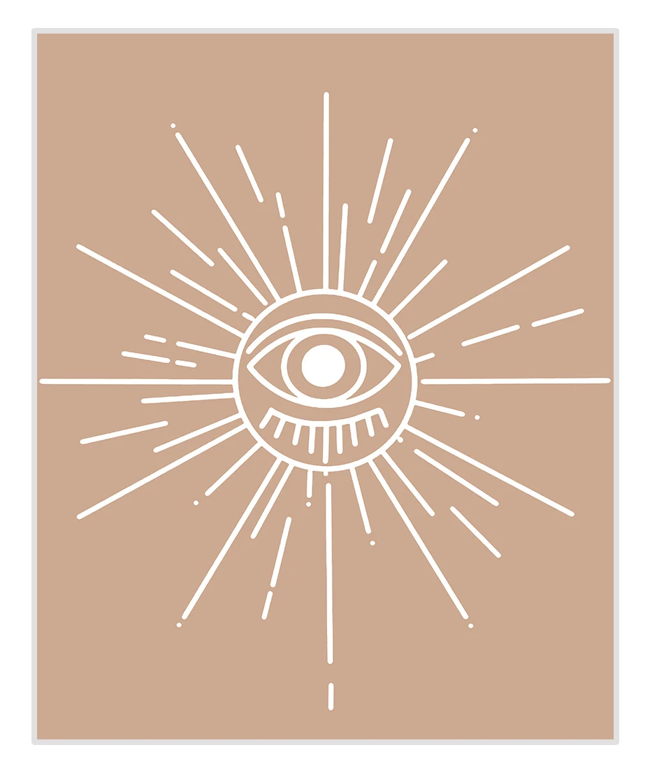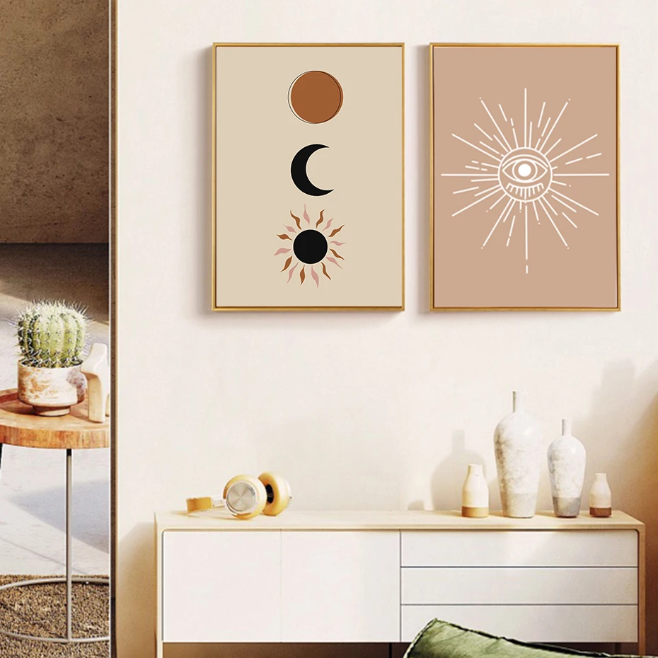 Картина с абстрактным пейзажем, солнце и луна, в стиле бохо