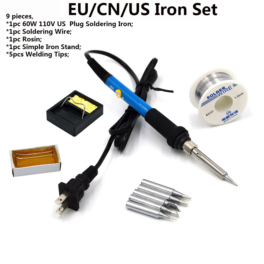 9 штук,* 1 шт. 60 Вт 110 В штепсельная вилка США паяльник;* 1 шт. паяльная проволока;* 1 шт. канифоли;* 1 Простая железная подставка;* 5 сварочных наконечников;
