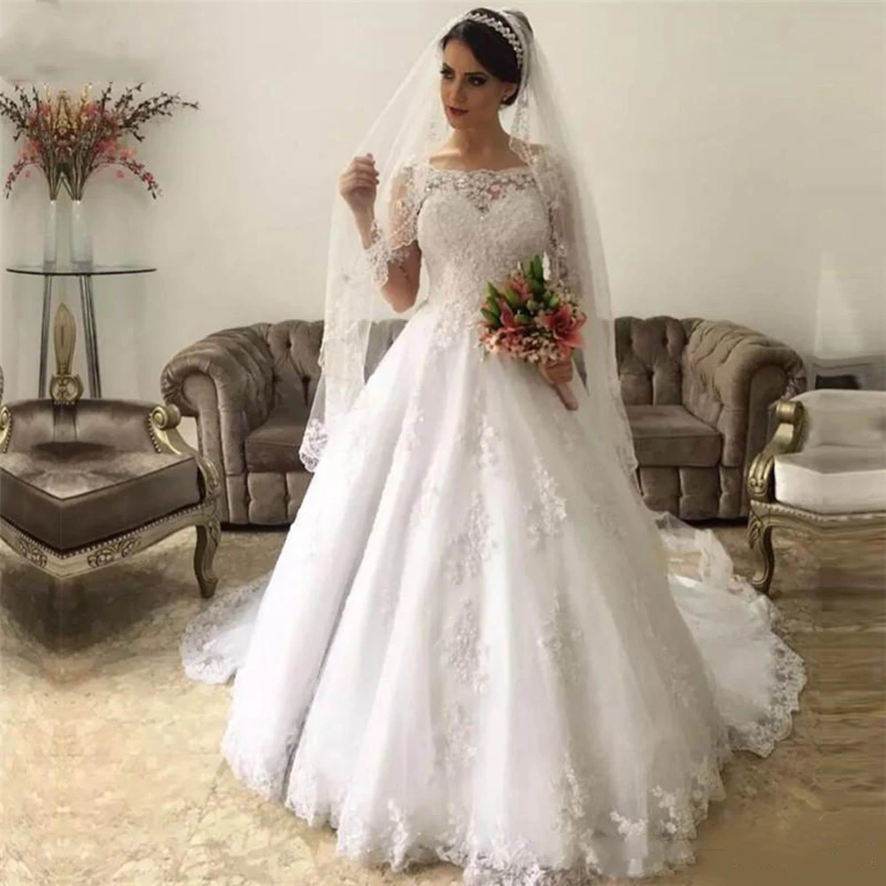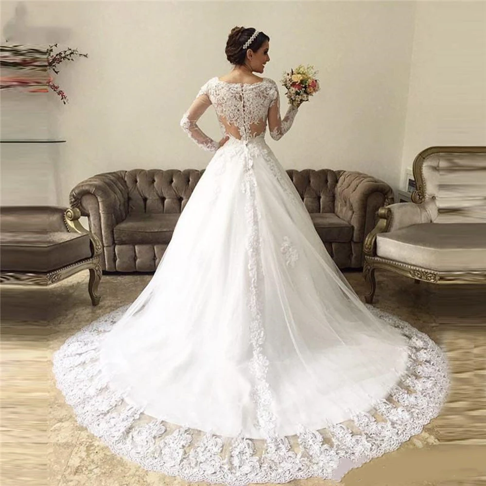 Кружевные свадебные платья на заказ с длинным рукавом 2021 с аппликацией и глубоким круглым вырезом тюлевые Свадебные платья со шлейфом