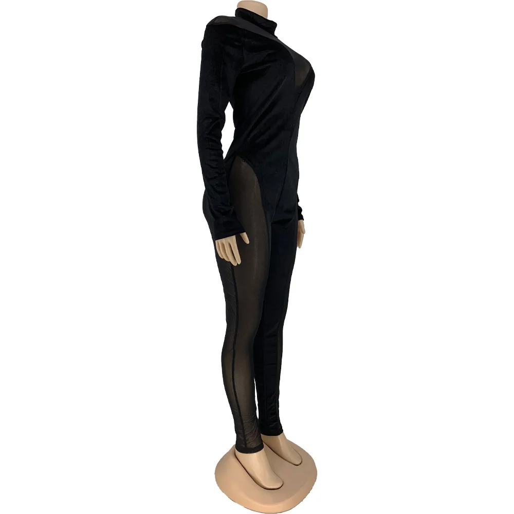 Adogirl сексуальный сетчатый лоскутный бархатный комбинезон, Модный облегающий комбинезон с длинным рукавом и ложным воротником, Осенний цельный комбинезон для ночного клуба