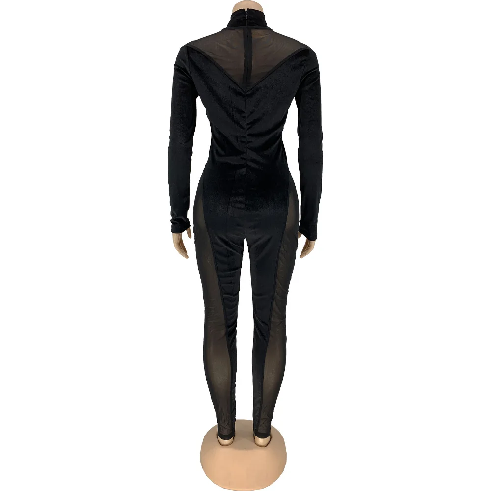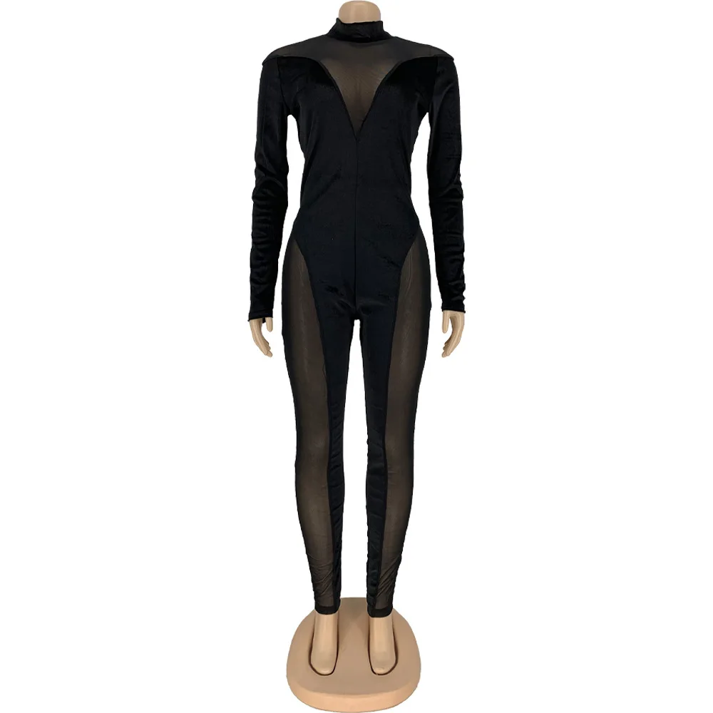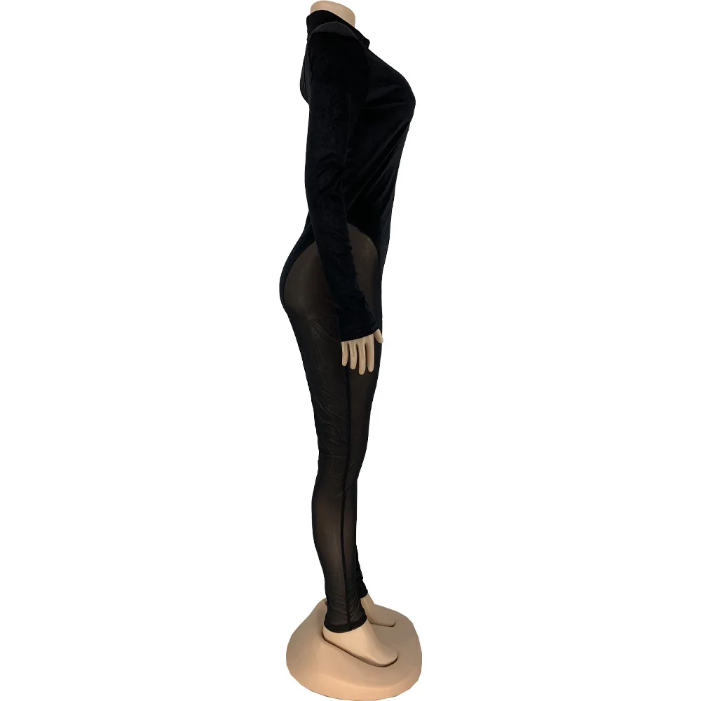Сексуальный прозрачный сетчатый лоскутный бархатный комбинезон Adogirl, Модный облегающий комбинезон с ложным воротником и длинным рукавом, Осенний цельный комбинезон для ночного клуба