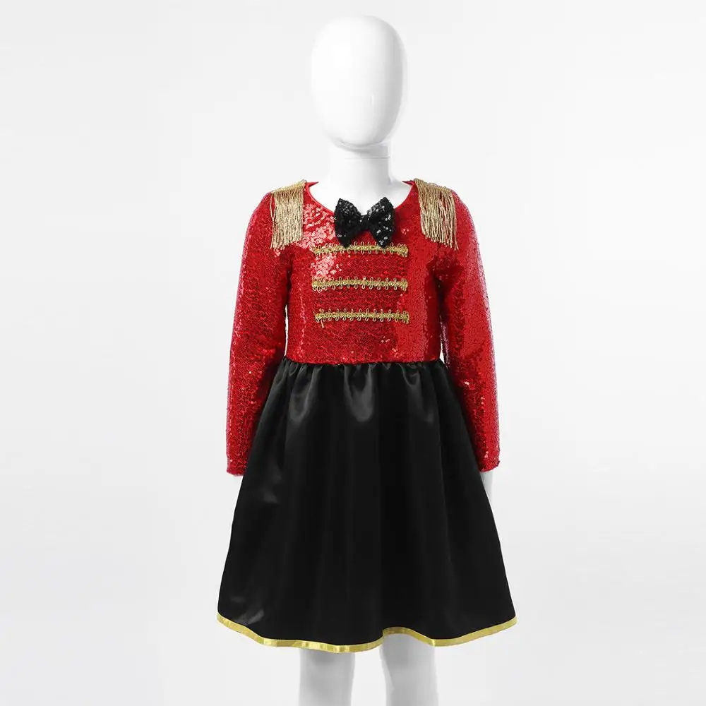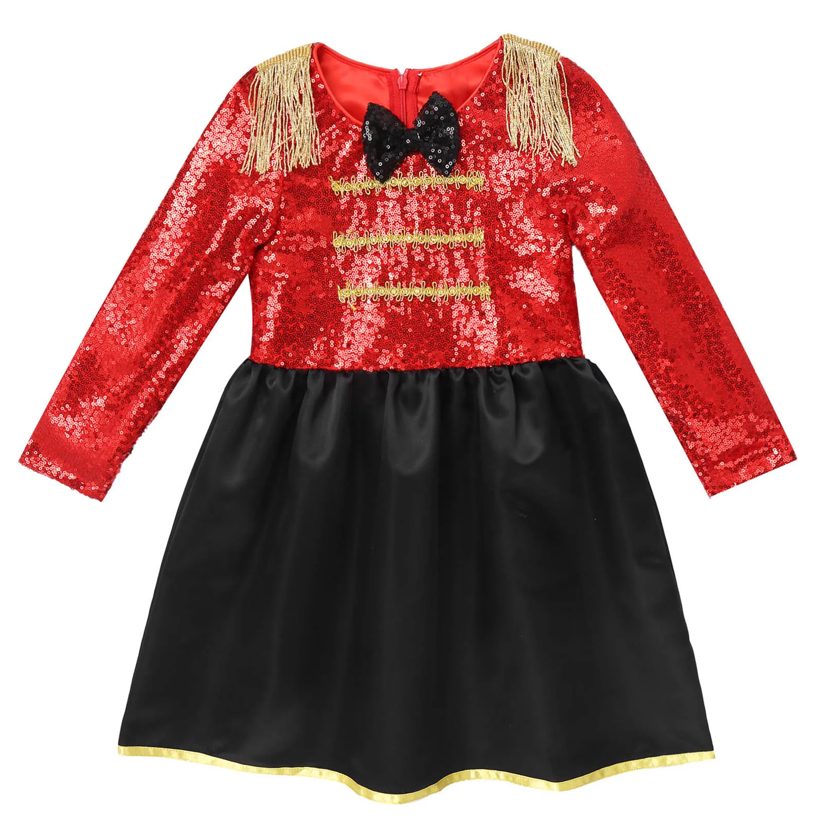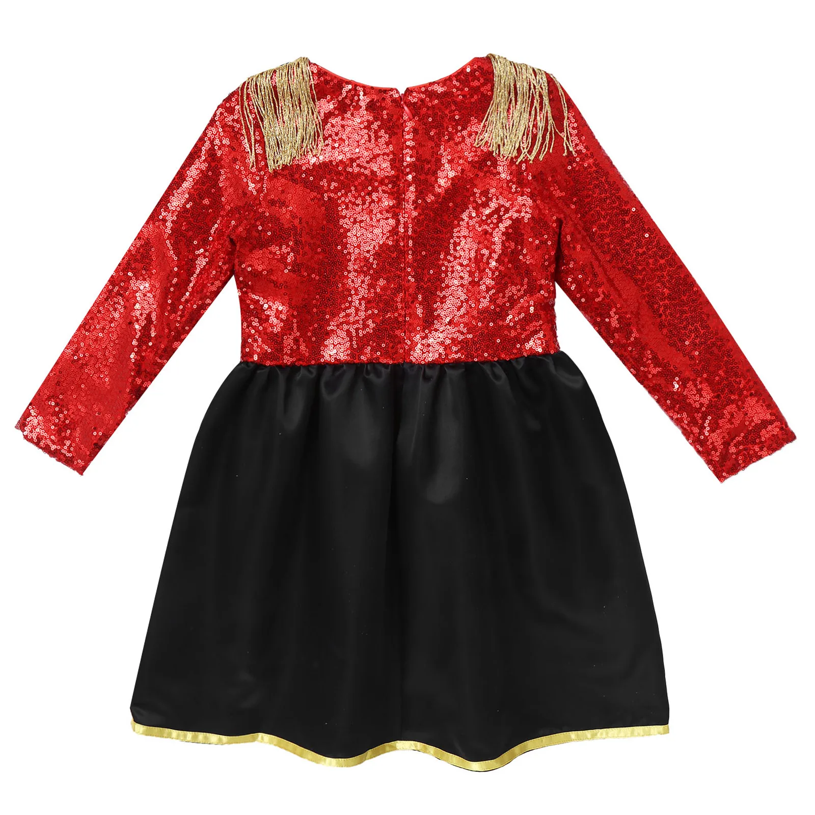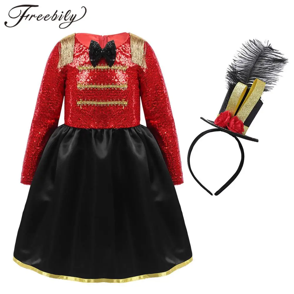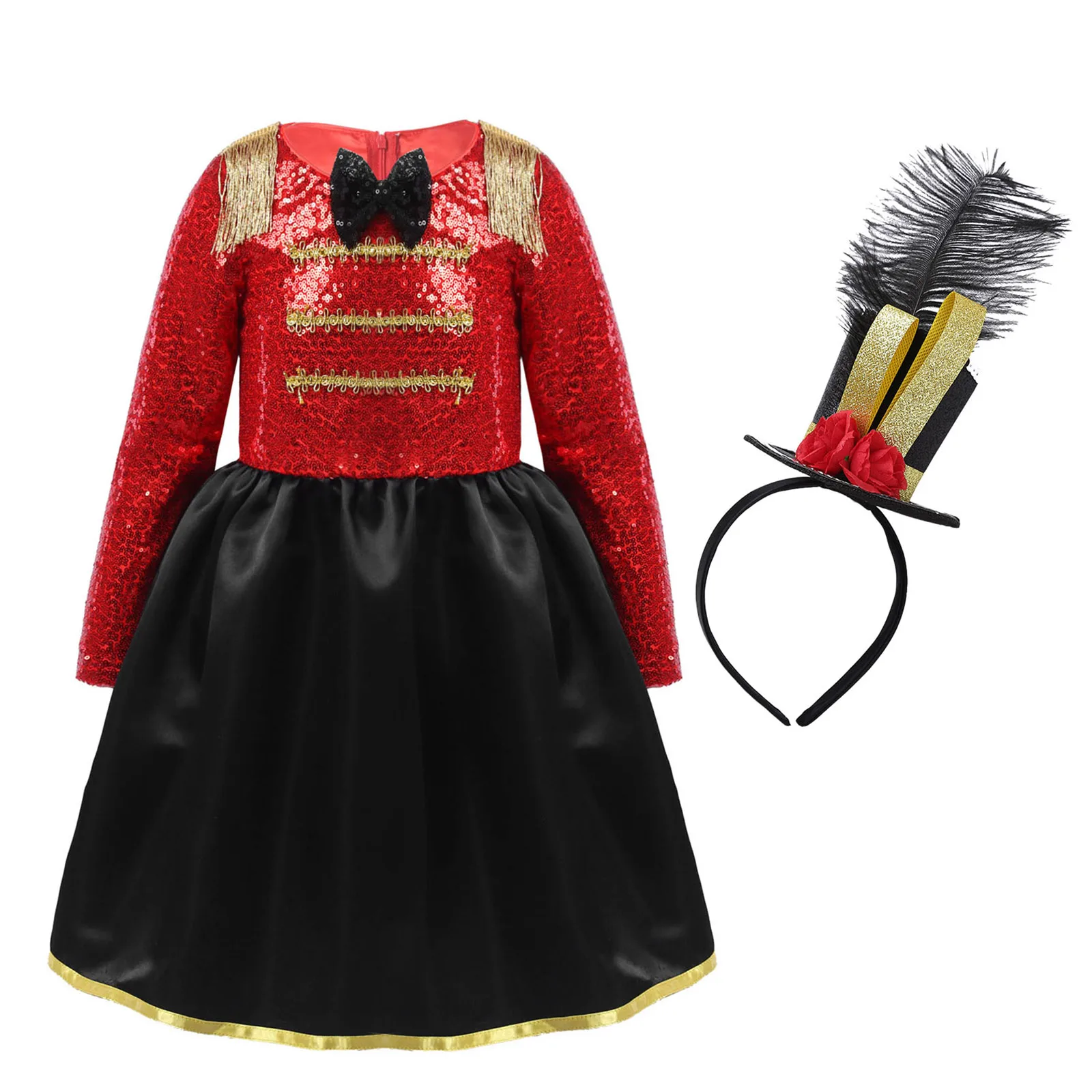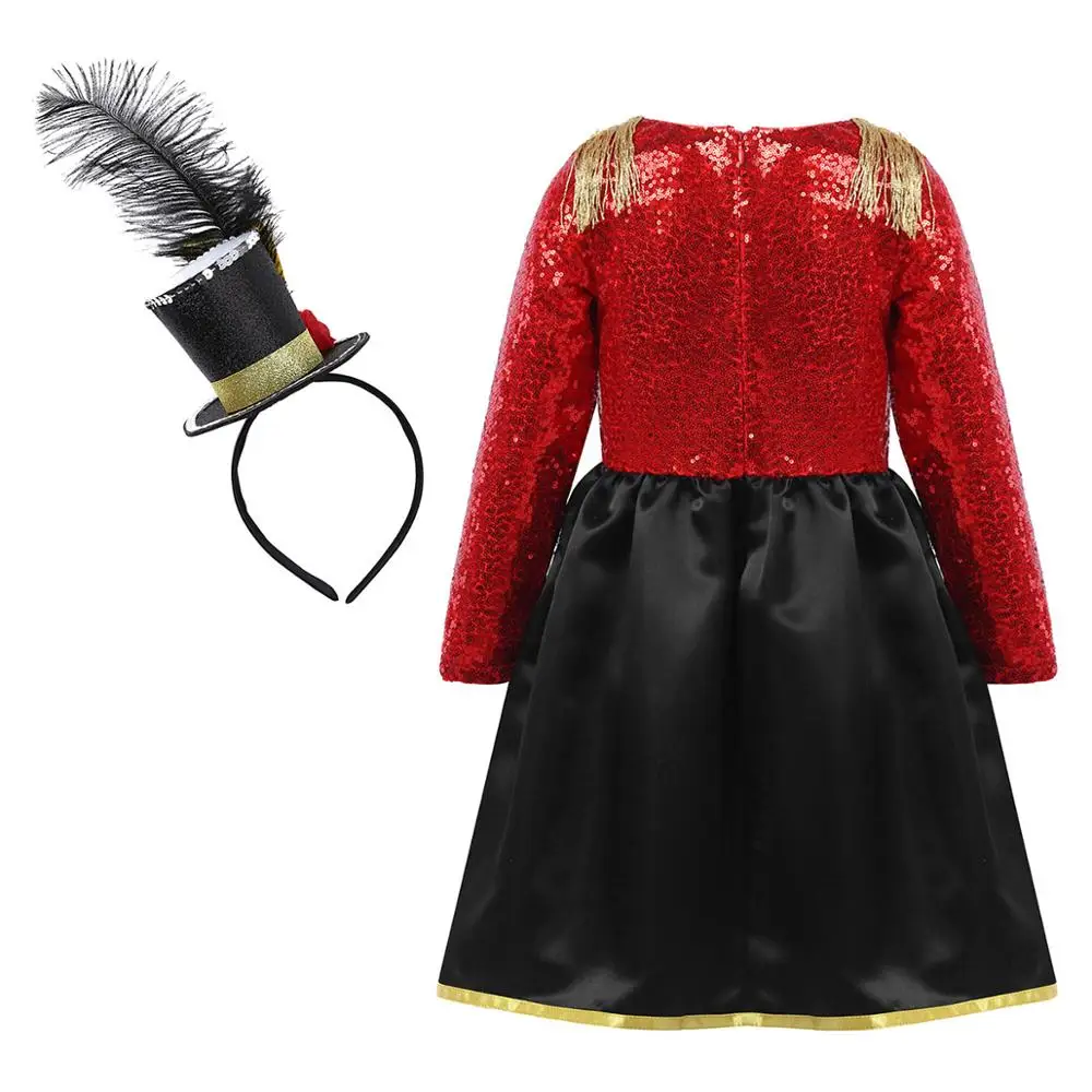 Детский маскарадный костюм на Хеллоуин; Платье девочки Ringmaster наряд цирк костюм блестящее платье, расшитое блестками с мини-цилиндр ободок-Вуалетка