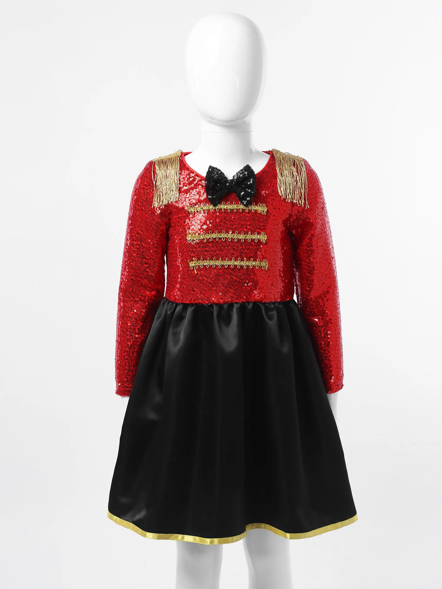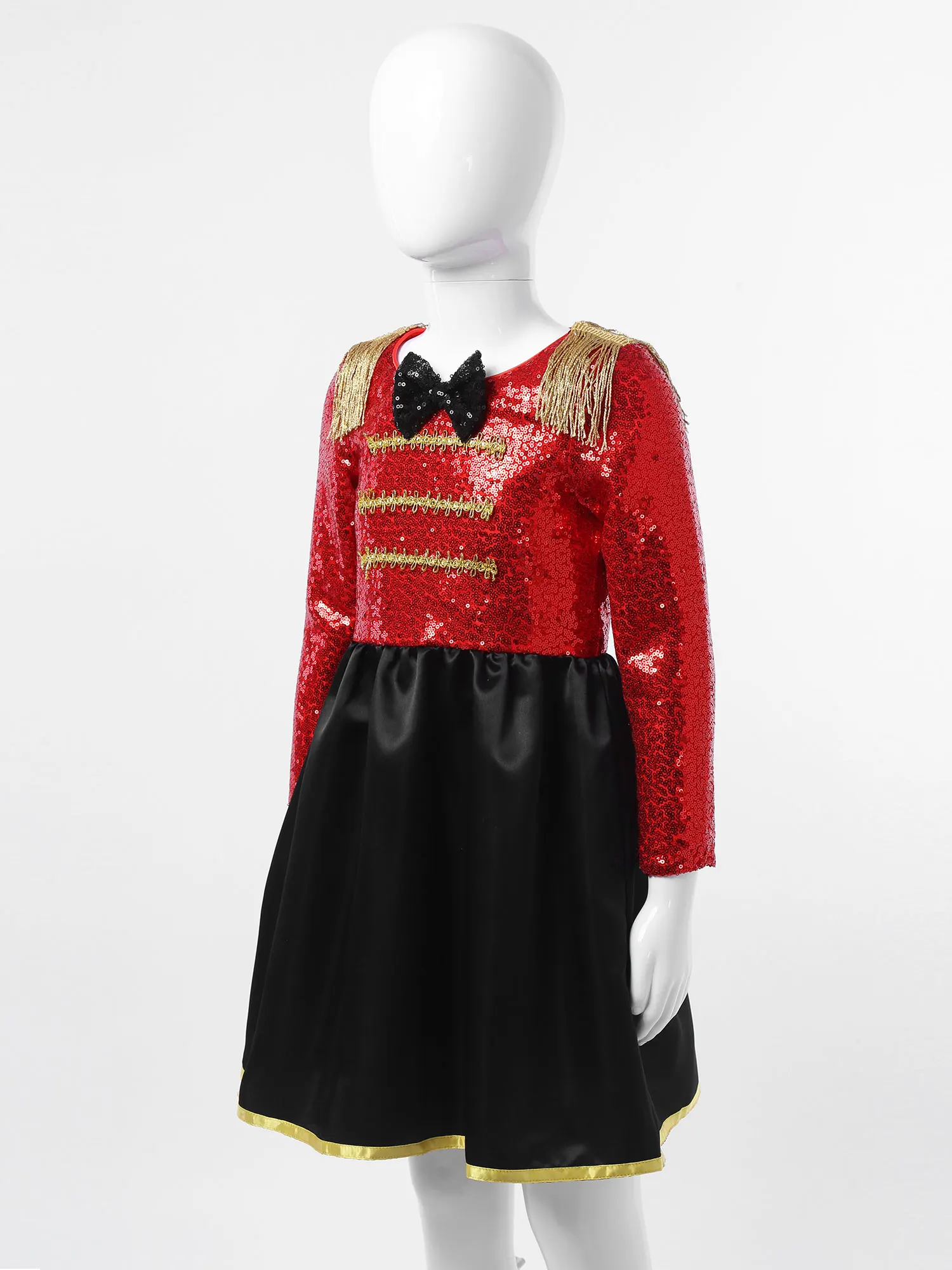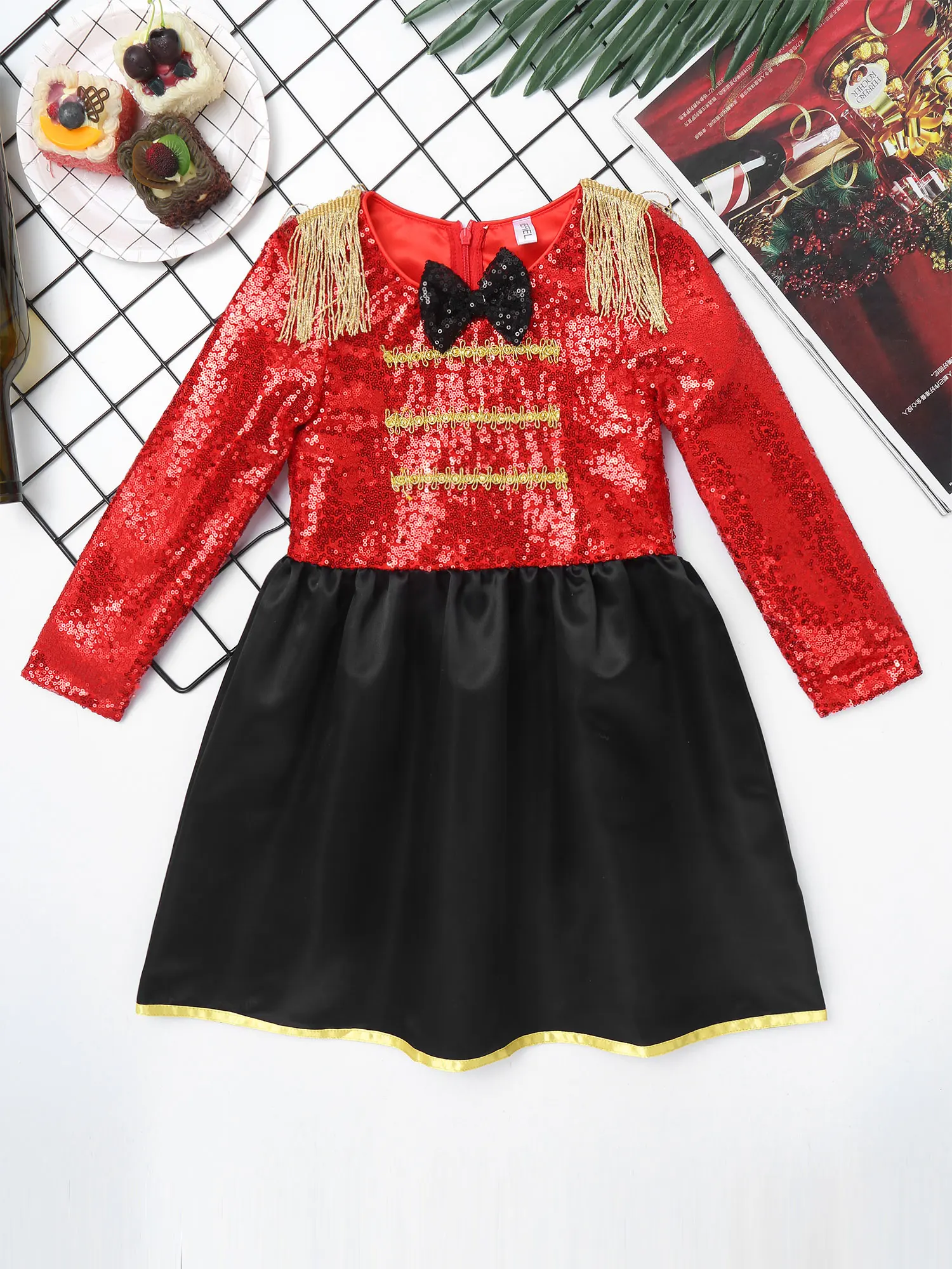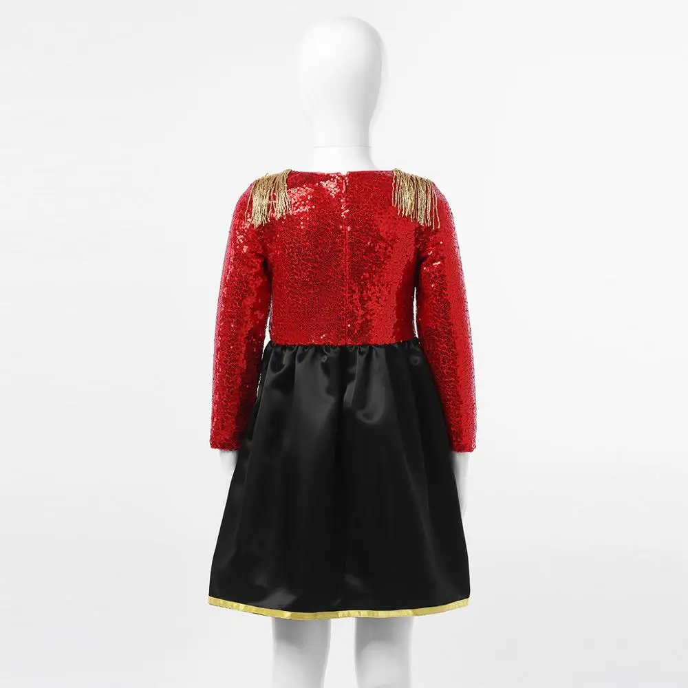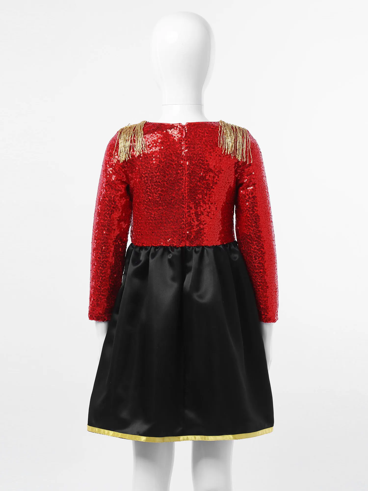 Детский маскарадный костюм на Хеллоуин; Платье девочки Ringmaster наряд цирк костюм блестящее платье, расшитое блестками с мини-цилиндр ободок-Вуалетка