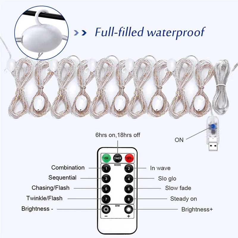 Гирлянда на окно, водонепроницаемая, 300 светодиодный, 8 режимов