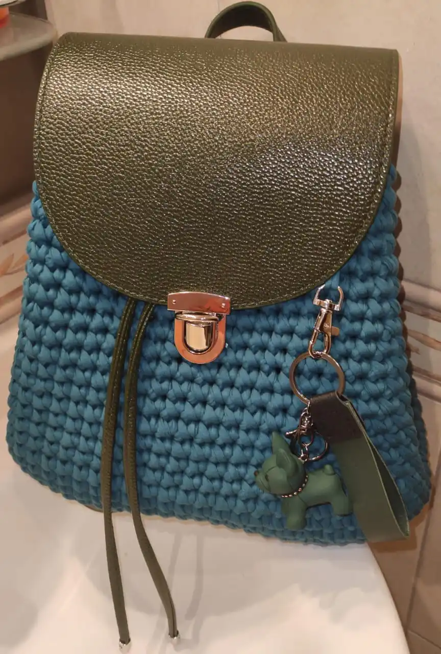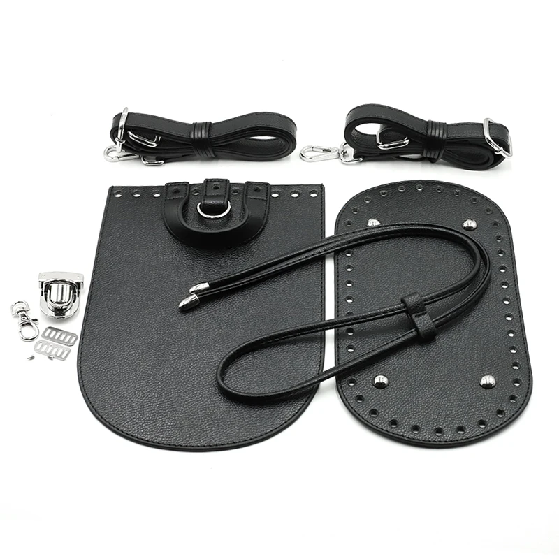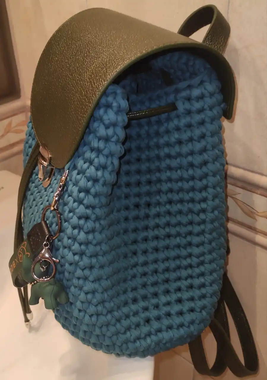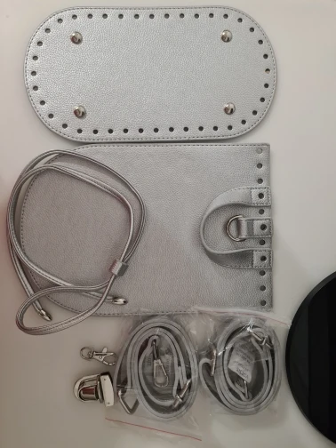 Внешний вид выше всяких похвал, заменитель кожи хорошего качества, только немного жестковат, напыление скорее всего со временем облезет, но поносить в свое удовольствие хватит. В комплекте нет полуколец, но это не критично, остальное что нужно для рюкзака присутствует. Размер донышка довольно большой, рюкзак будет очень вместительный. Сильного запаха я не почувствовала, присутствует обычный для кожзаменителя. Комплект хорошо подойдет для начинающих в деле создания вязаных сумок.