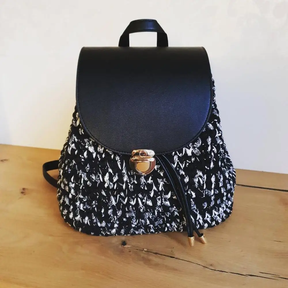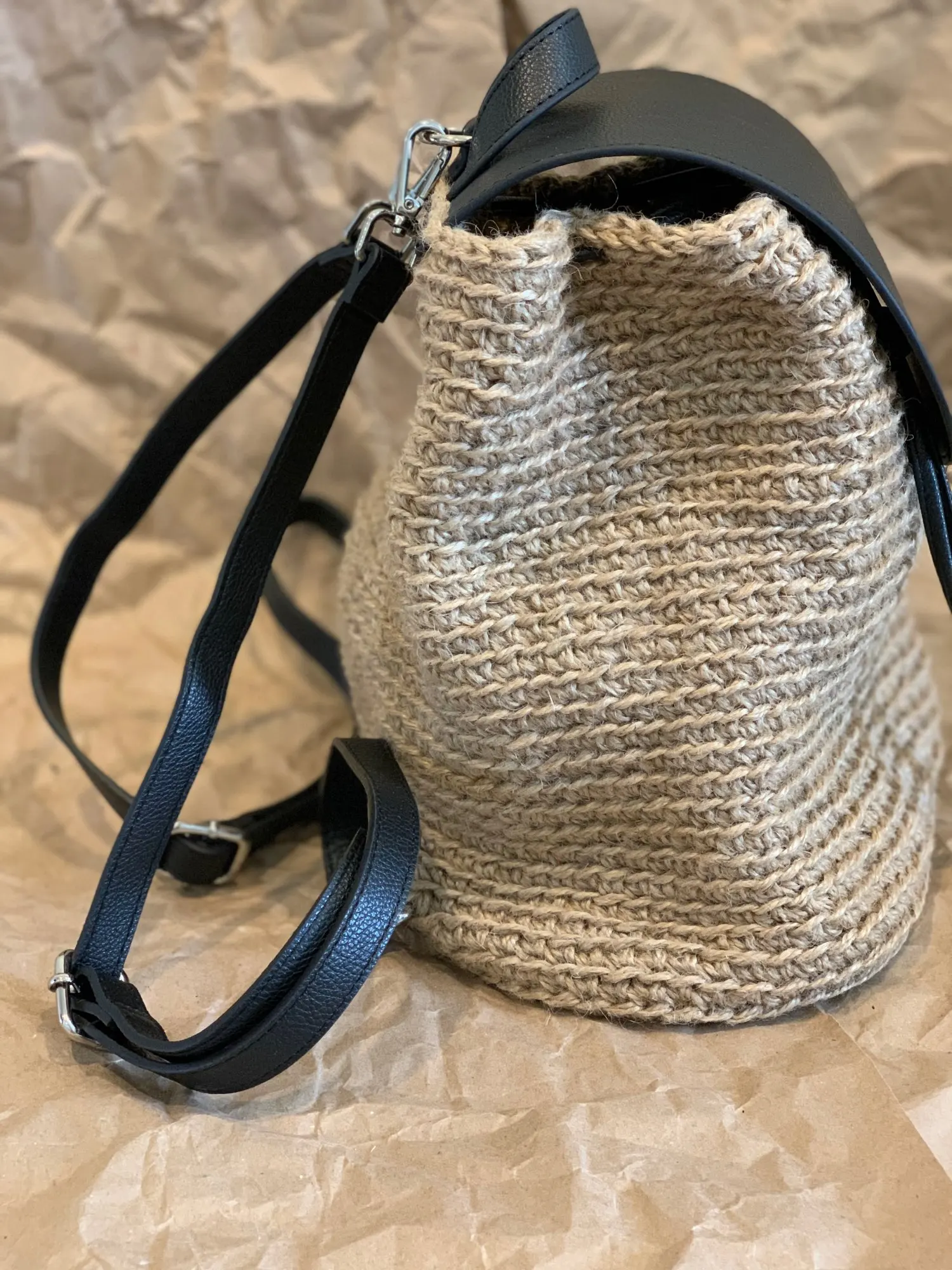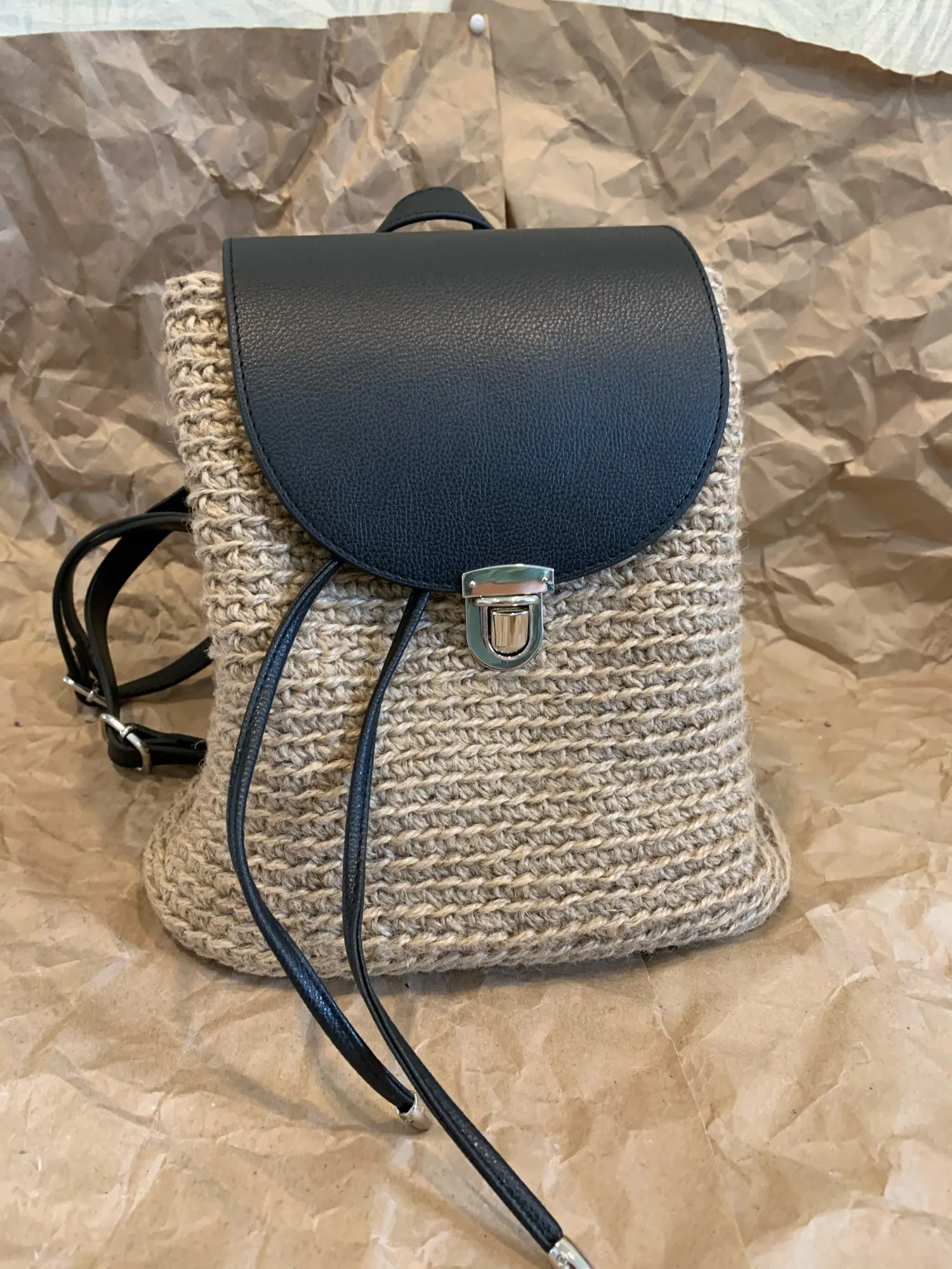 Внешний вид выше всяких похвал, заменитель кожи хорошего качества, только немного жестковат, напыление скорее всего со временем облезет, но поносить в свое удовольствие хватит. В комплекте нет полуколец, но это не критично, остальное что нужно для рюкзака присутствует. Размер донышка довольно большой, рюкзак будет очень вместительный. Сильного запаха я не почувствовала, присутствует обычный для кожзаменителя. Комплект хорошо подойдет для начинающих в деле создания вязаных сумок.