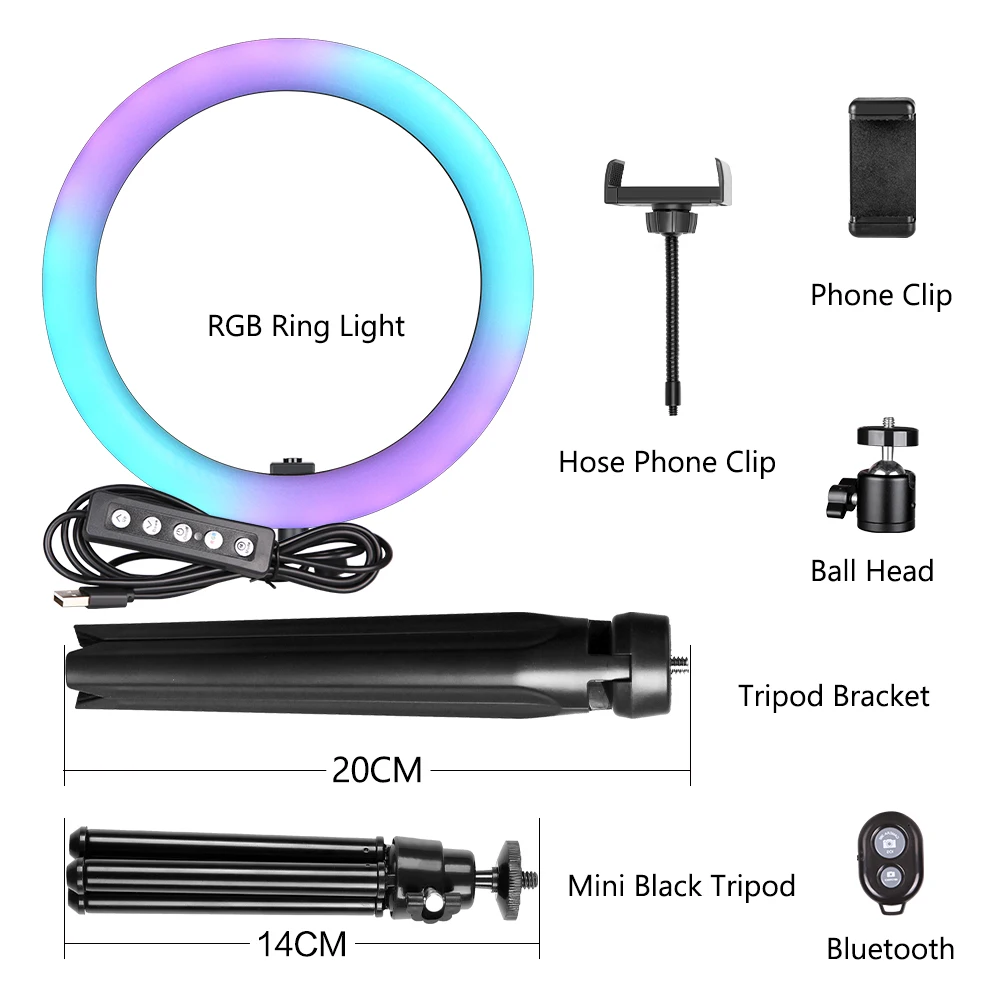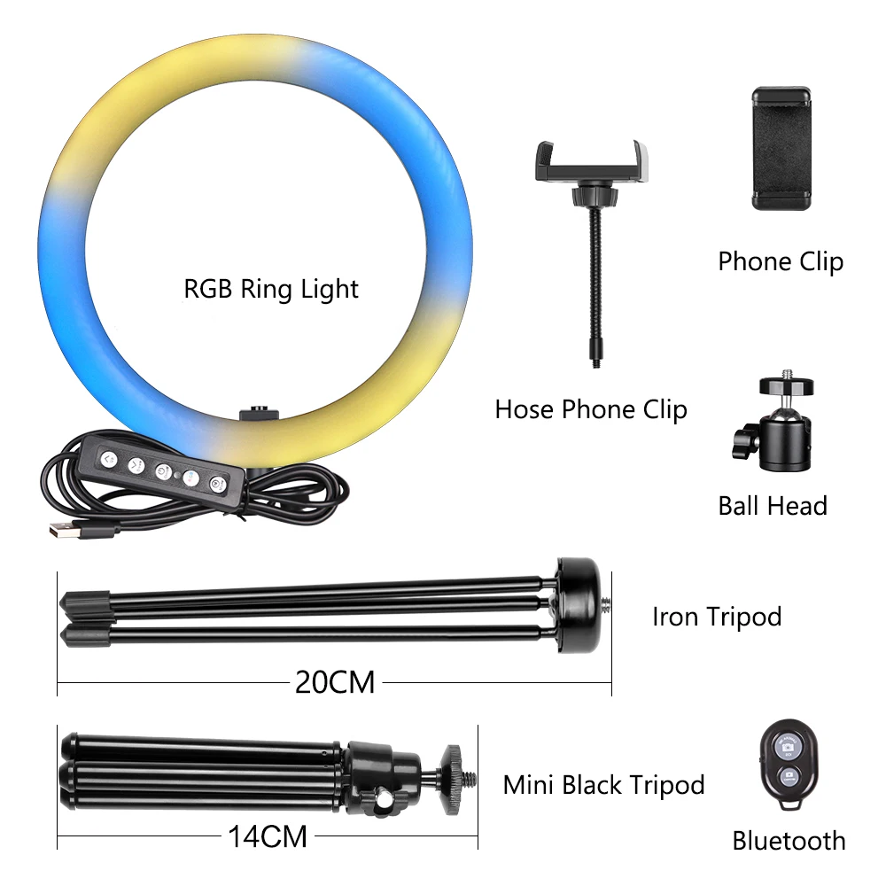 1x10 дюймов кольцевой светильник (RGB)1 x зажим для телефона1 х 20 см железный штативШаровая Головка-1 шт.1 x Bluetooth