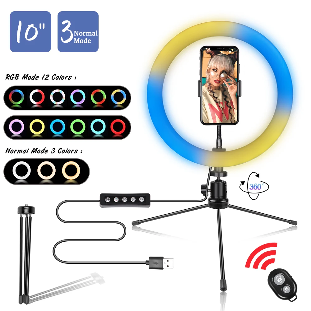 1x10 дюймов кольцевой светильник (RGB)1 x зажим для телефона1x20 см Настольный ШтативШаровая Головка-1 шт.1 x Bluetooth
