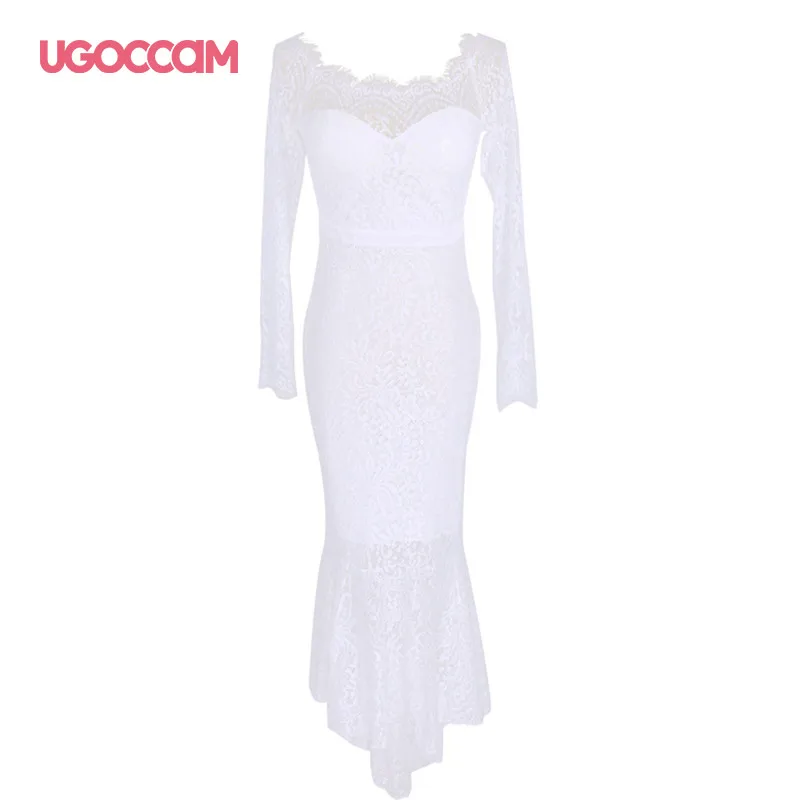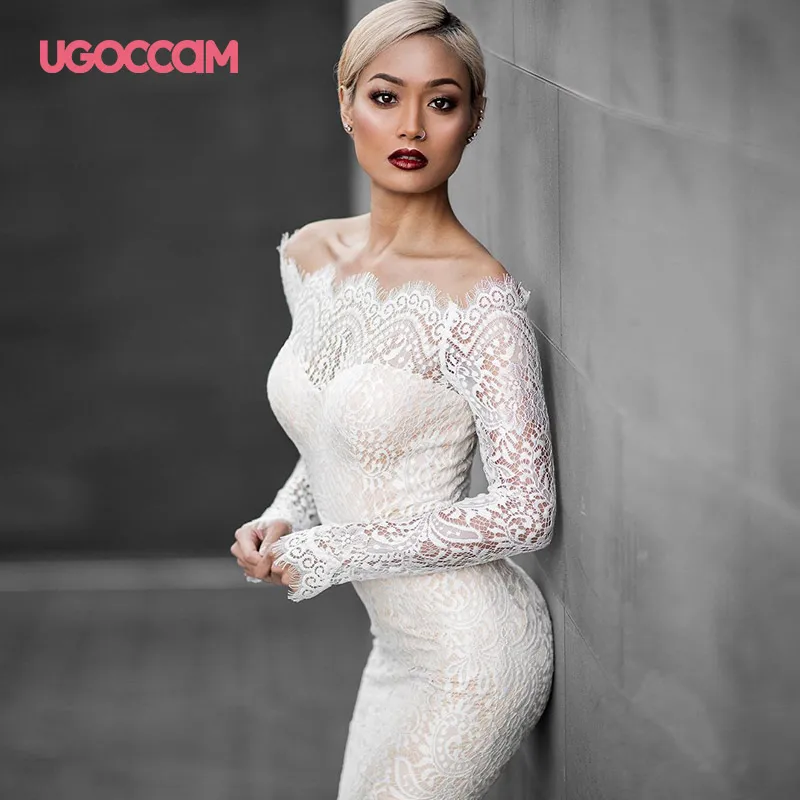Женское кружевное платье с открытыми плечами UGOCCAM, вечернее платье без бретелек, с длинным рукавом