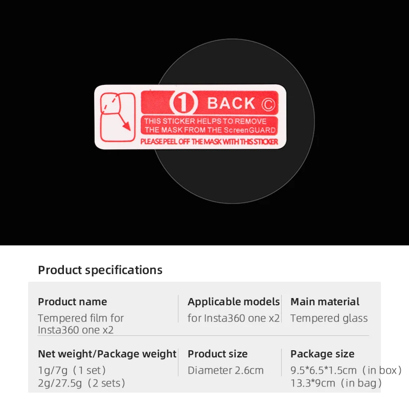 Особенности:1. Совместим с камерой Insta360 One X2.2. Твердость 9H, защита от царапин, трещин, масла, отпечатков пальцев.3. Высокое разрешение и высокий коэффициент пропускания, восстановление насыщенных цветов камеры.4. Защитите ЖК-экран и объектив вашей камеры от поломки, пыли и царапин, предлагает жесткую, прочную, прозрачную поверхность, сохраняя ЖК-экран чистым и нецарапанным.5. HD-пленка, гладко прикрепленная с помощью самоклеящейся поверхности, высокая чувствительность к касанию. Характеристики:Материал: закаленное стеклоЦвет: прозрачныйВес нетто: около 4,5 г (2 комплекта)Размер продукта: диаметр: около 2,6 смПодходит для панорамной экшн-камеры Insta360 One X2 Sport Упаковочный лист:2 комплекта * пленка из закаленного стекла Примечания:1. Не включает камеру Insta360 one x2.2. Переход: 1 см = 10 мм = 0,39 дюйма.3. Возможны отклонения в 1-3 мм из-за ручного измерения. Перед заказом убедитесь, что вы не возражаете.4. Из-за разницы между различными мониторами изображение может не отражать реальный цвет изделия, пожалуйста, убедитесь, что вы не возражаете перед заказом, спасибо!