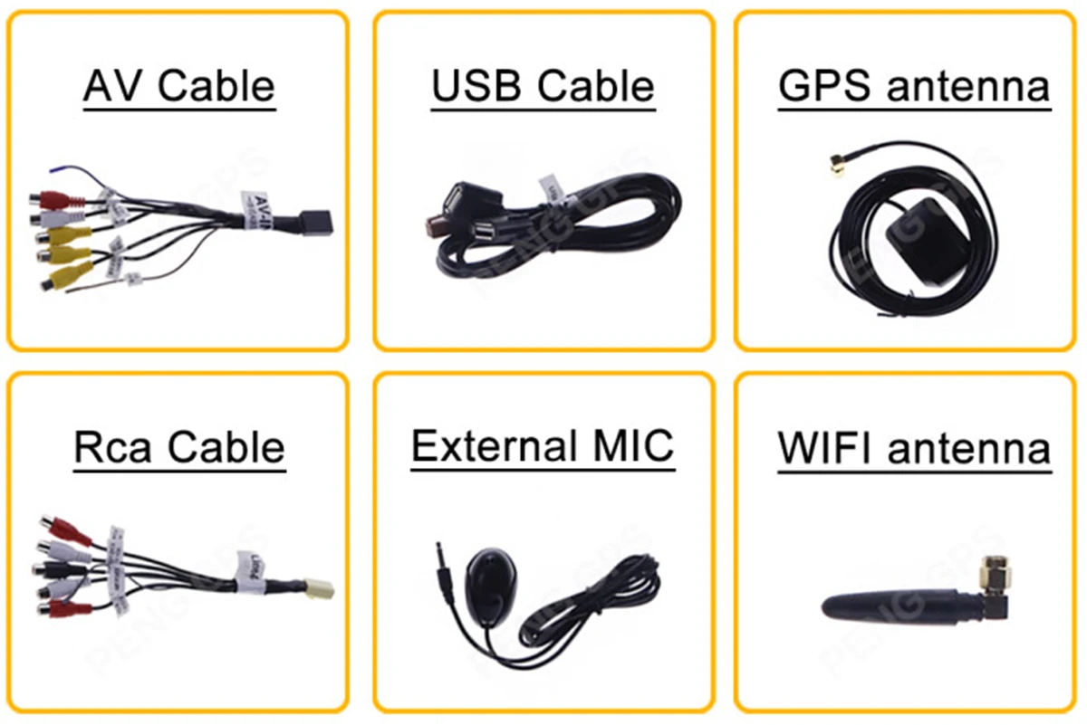 Наш продукт поставляется с GPS антенной, gps-картой для вашей страны, usb-адаптером, аудио и видео входным кабелем, кабелем питания... и т. д., все наборы для установки будут в посылка.