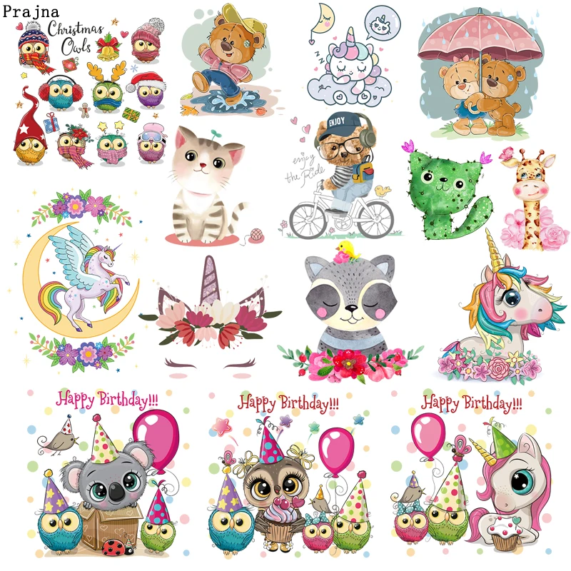 Наклейки Prajna с утюгом для глажки, Мультяшные наклейки с маленькими животными, единорогом, коалой, совой, медведем, котом, термотрансферные наклейки для тканевой аппликации