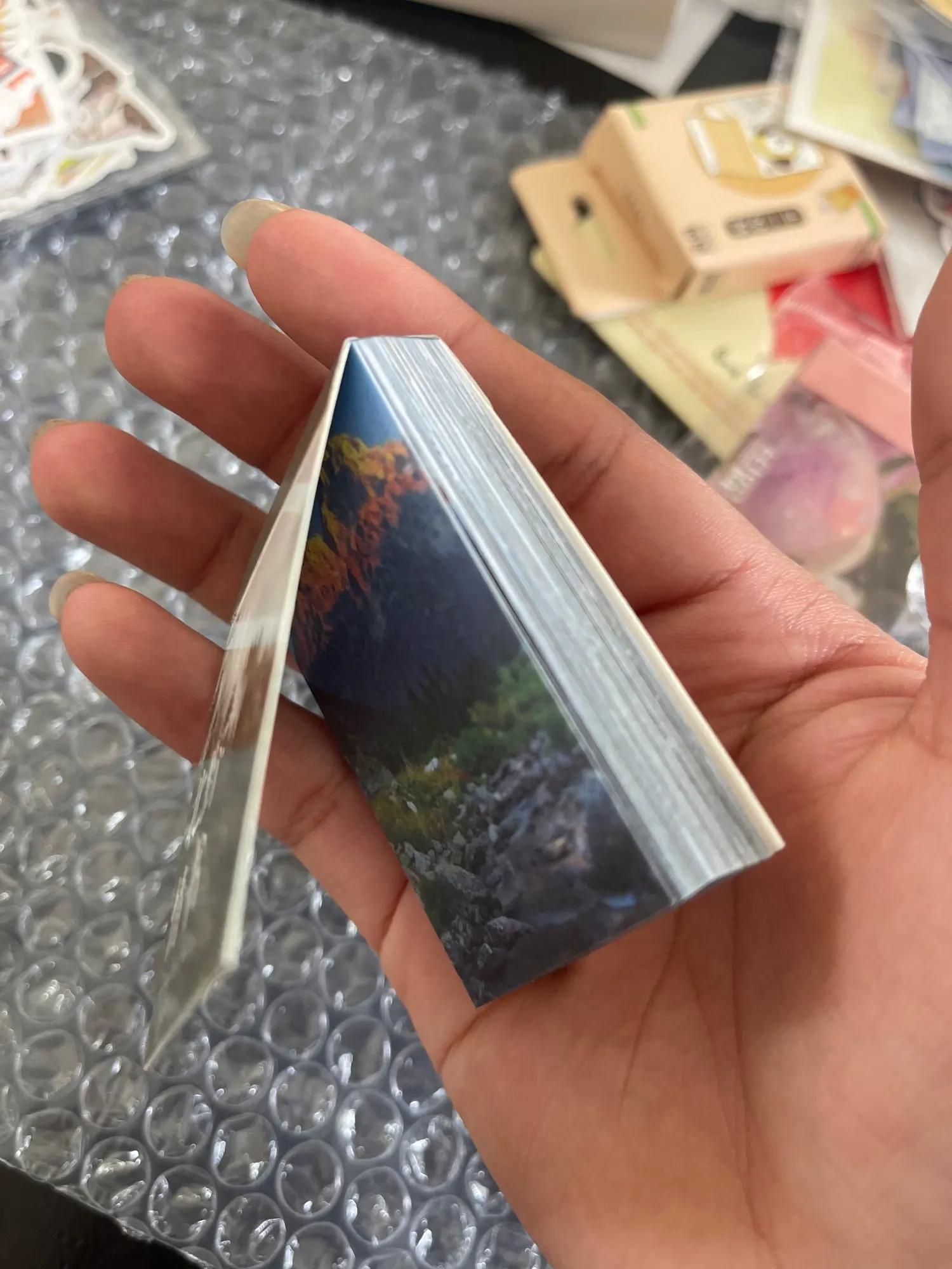 Доставка в Спб очень быстрая, приехало вместе с несколькими другими заказами канцелярии. Очень милый набор. Размер 6х4 см, матовые, клейкой основы нет, это не стикеры все таки. Фото с городами очень четкие, остальные уже не так, но все еще красиво. Закажу еще с другими принтами :)
