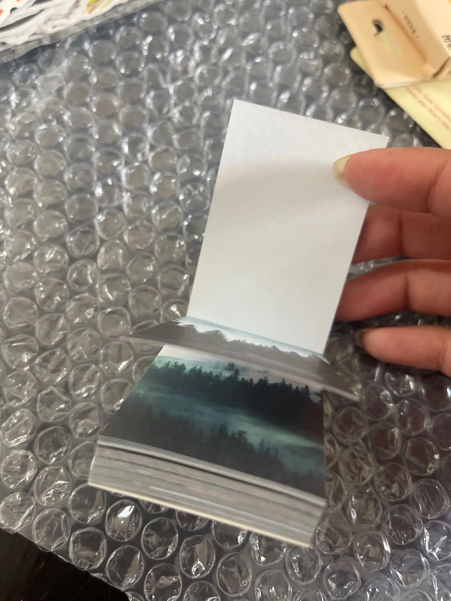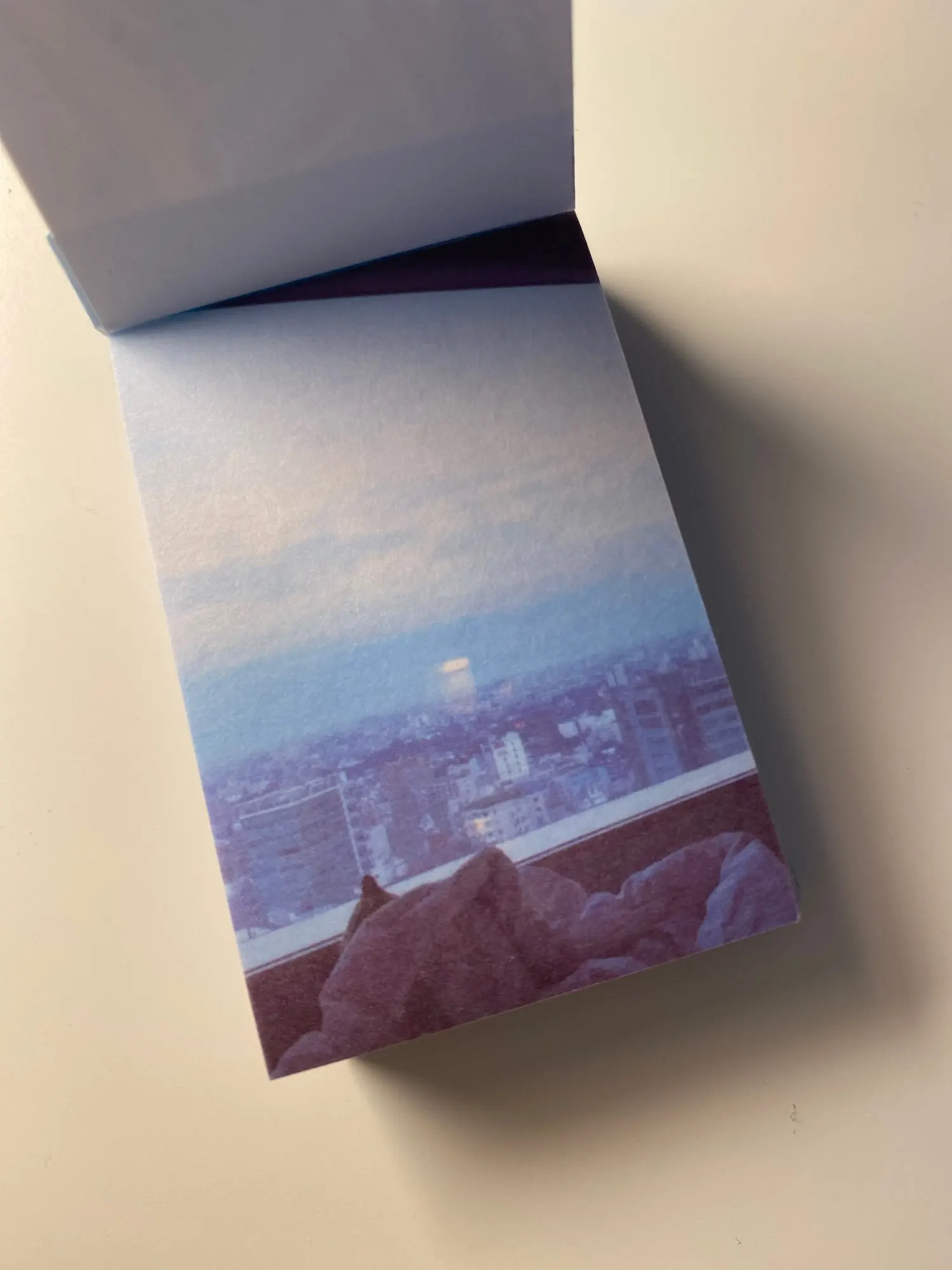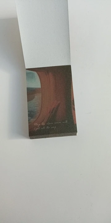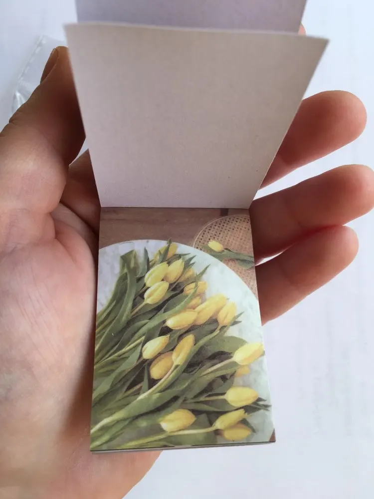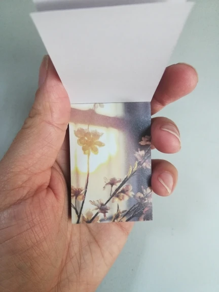 Очень миниатюрный блокнотик с фото в одной цветовой гамме. Качество печати на на мой взгляд хромает, некоторые картинки слегка расплываются. Каждый листик представляет собой фото на тонкой бумаге с липким слоем, основу поддеть довольно трудно, уголок сминается сильно, как клеется к бумаге ещё не проверяла. Но вообще товар понравился) Дошла посылка из двух товаров за срок чуть больше двух недель, но по какой-то неизвестной ошибке посылка пролежала на Почте России ещё столько же, пока я сама за ней не пришла. В целом покупкой довольна, рекомендую и товар, и продавца, который заказ отправил на следующий же день после оплаты)))