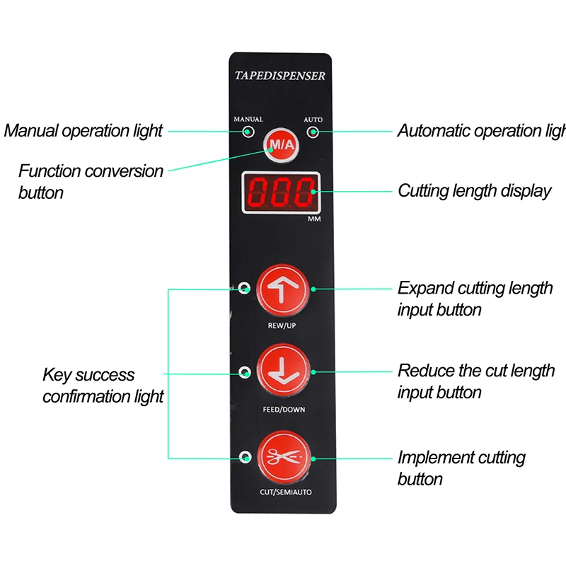 Мощность: AC110V/220V 50/60HZ 25W Максимальная ширина ленты: 8 мм-80 мм Максимальный диаметр рулона: ø300 мм Скорость подачи: 150 мм/сек. Вес: 5,5 кг (лидер + аксессуары продаются отдельно) Размер: 190 (Ш) * 140 (В) * 230 (Д) мм Приложенная лента: клейкая лента, не клейкая лента Меры предосторожности при использовании диспенсера ленты Когда лента свернута в подающий ролик, выключите питание и удалите ленту. При замене детали выключите питание. Комплект с верхним и нижним лезвиями легко наклеивается клейкой лентой, что приведет к тому, что резка не будет так гладко, поэтому, пожалуйста, своевременно очистите лезвие. Оцинкованный набор лезвий с помощью масла или смазки может эффективно улучшить срок службы. Аварийная съемка Поверните, когда лента Подающая кудрявая поверните регулировочные клавиши катушки по часовой стрелке или замените катушку. , Когда автоматическая подача не работает, проверьте, является ли сенсорная часть режущего устройства чистой или нет. Описание функции 1) Вставьте разъем в гнездо, включите выключатель питания. 2) Поднимите ленту и вращайте ленту, затем используйте ленту для фиксации ленты. 3) после прослушивания электронных звуков светодиодный дисплей с ручным режимом и светодиодный (9) мигает. 4) вставьте конец ленты в центр центра ролика и аккуратно нажмите верхнюю часть ленты, а затем нажмите кнопку (6) , кнопку (9) светильник s включит светильник, и лента будет отправлена в порт разрядки. В тех случаях, когда лента отправляется снаружи кнопка (10) светильник s будет светильник или похода по магазинам. 5) когда кнопка (10) мигает, нажмите кнопку резки (7) , режущая лента может быть отправлена на ленту конца. 6) Пресс кнопка (3) один телескопический зуб бороны, (1)(поскольку мерки снимаются вручную) и (2) (автоматический режим) светильник s, светильник, в данным принятым условием; пользователь может отрезать требуемую длину. 7) чтобы установить требуемую длину резки (от 20 мм до 999 мм регулируется), вы можете нажать кнопку (5) и кнопку (6) . 8) в полуавтоматическом режиме (пункт 5) , снимите отрезную ленту, нажмите кнопку (7) (резка), в соответствии с требуемой длиной резки, лента будет отправлена снова и в режиме ожидания, полуавтоматическая может использоваться для резки слабой клейкой и неклейкой ленты, в это время нажмите кнопку (7) (Резка) еще раз, Диспенсер ленты может выслать ленту и длина является вашей необходимой 9) в полуавтоматическом режиме нажмите кнопку (3), кнопка (1) светодиодный светильник выключится, кнопка (2) включит светильник, так как это условие является автоматическим. В автоматическом режиме датчик высылает ленту в соответствии с установленной длиной