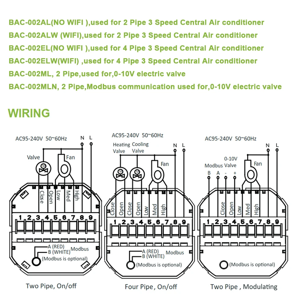BAC-002AL (без WIFI ), используется для 2 труб 3 скоростного центрального кондиционера BAC-002ALW(WIFI),Используется для 2 труб 3 скоростного центрального кондиционера BAC-002EL (без WIFI ), используется для 4 труб 3 скоростного центрального кондиционера BAC-002ELW(WIFI) , используется для 4 труб 3 скоростного центрального кондиционера BAC-002ML, 2 трубы, используется для, 0-10 в электрический клапан BAC-002MLN, 2 трубы, Modbus связь используется для, 0-10 в электрический клапан Все имеют функцию нагрева/охлаждения с подсветкой
