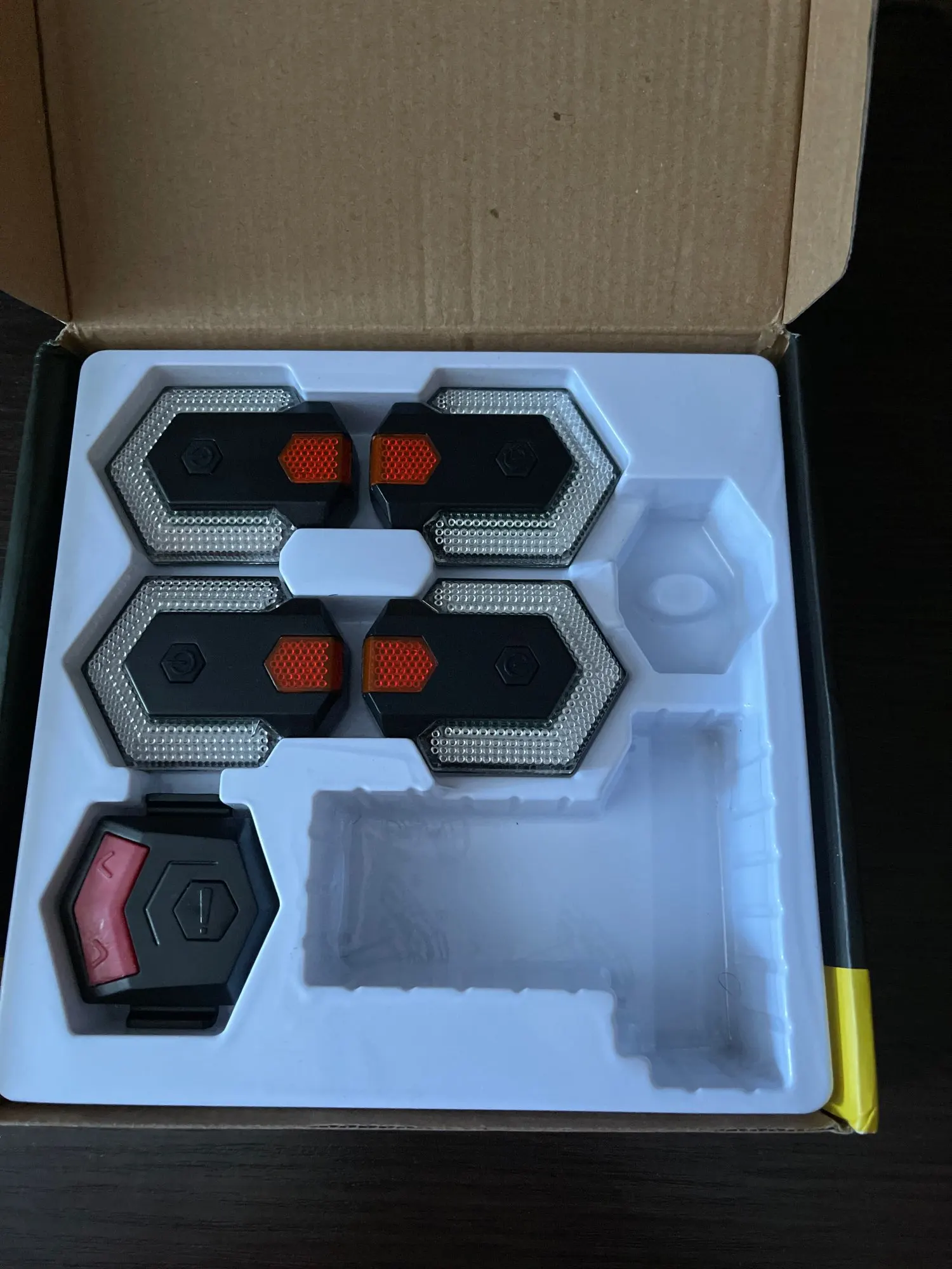 It comes totally discharged, however considering that it can't be turned off, it's ok Fully charged in ~4hours. Lights work really well, you need to pair them first to the remote control. You can even pair turn lights individually to the left and right button. For example, 1 light be for left turn button and 3 will be for the right turn button. But I will stay on 2-2. I can recommend the seller and this product.