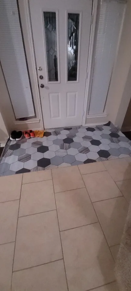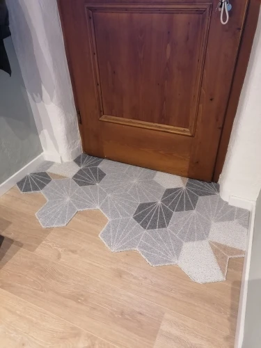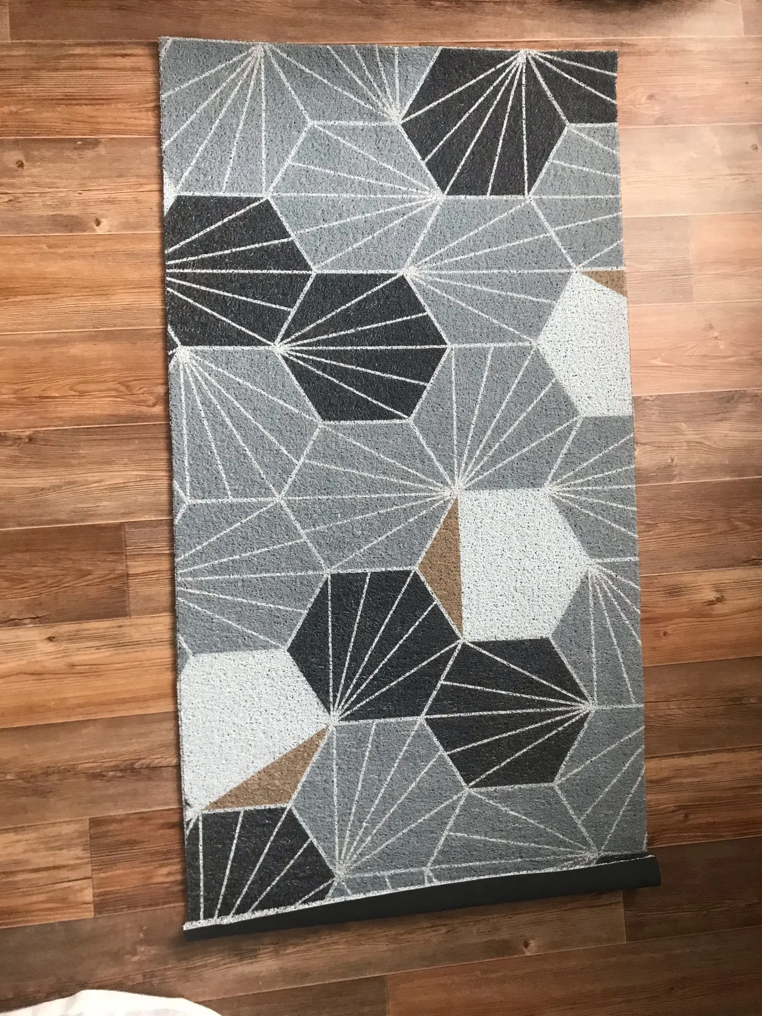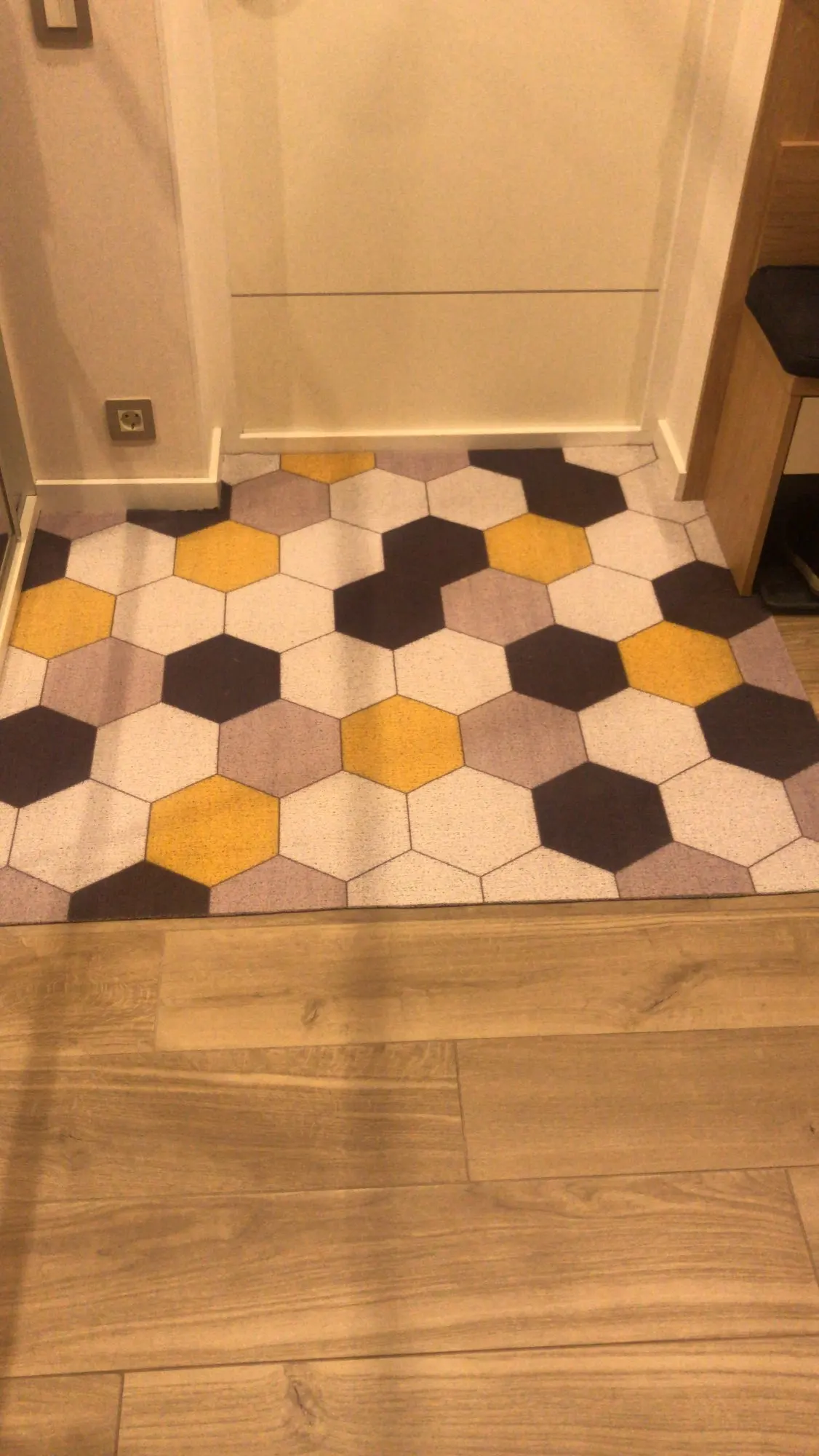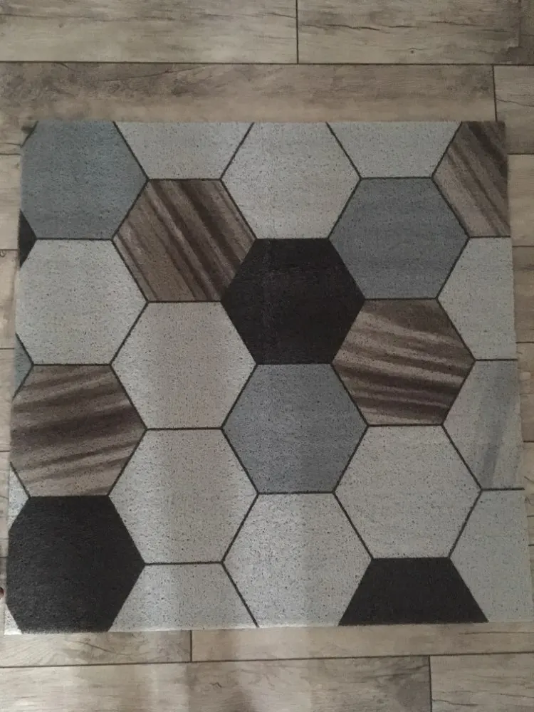 Ковёр хороший,правда думала шестигранники более зеленоватого оттенка,оказались желтые.Но ковёр выглядит достойно и надежно,есть небольшой запах,но думаю выветриться.Привезли ковёр службой dpd курьером домой,но шёл долго до Москвы больше месяца