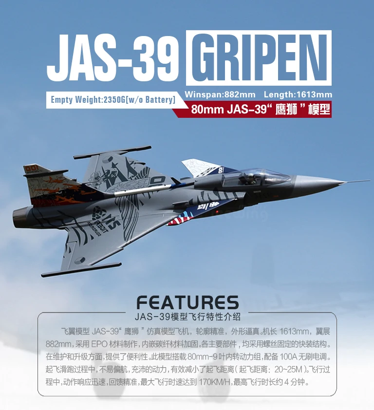 2020 Freewing Новый электрический 80 jet RC самолет 80 мм edf Jas-39 Gripen самолет JAS39 EPO airframe Размах крыльев: 882 мм Длина: 1613 мм Вес полета: 2350 г (без аккумулятора) Канальный вентилятор: 80 мм 9-лезвий EDF ESC: 100A/BEC 5A Мотор: 3658-1920KV внешний бегунок бесщеточный мотор Сервоприводы: 9g Digital(12 шт) Посадочная шестерня: выдвижная посадочная шестерня Зубчатая дверь: носовая посадочная Шестерня дверная система Требуемая Батарея: 6s 4000-5200mAH батарея шт (не входит в комплект) Требуется Зарядное устройство: 6S зарядное устройство (не входит в комплект) Требуется Радиоуправление: 2,4 Ghz 6ch RC + (не входит в комплект)