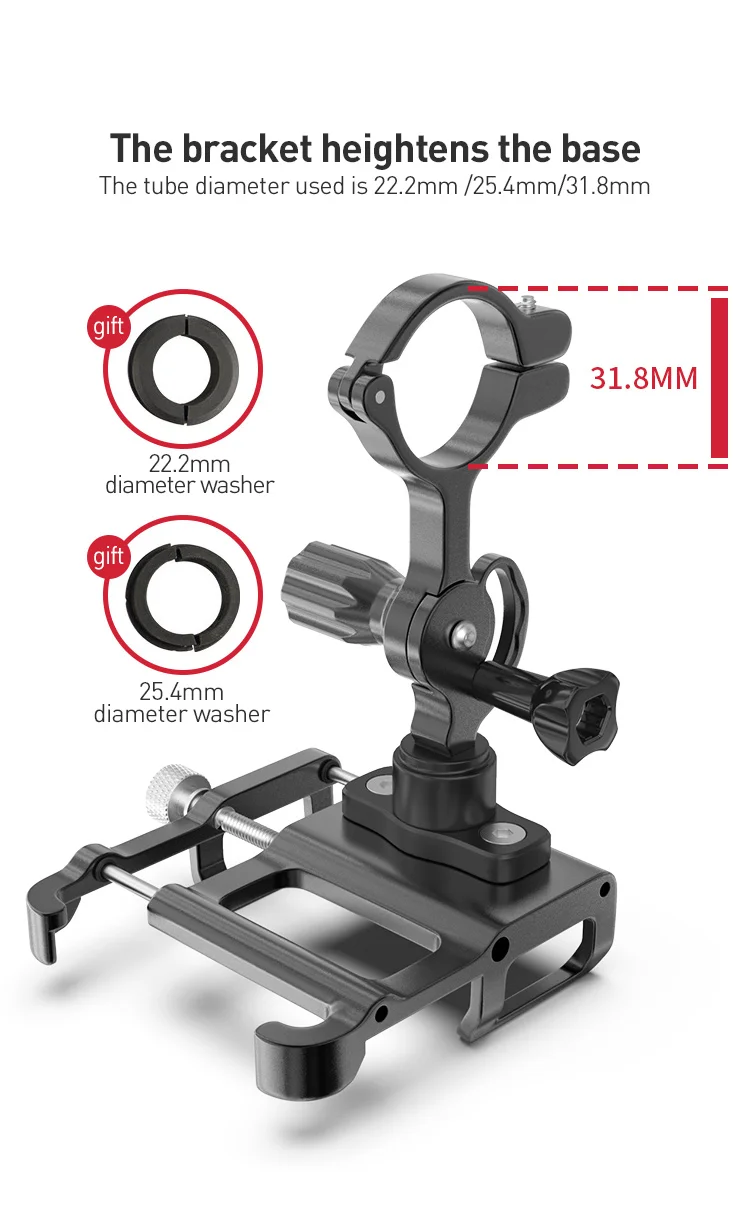 Технические характеристики:1. Материал: алюминиевый сплав2. Тип: MTB дорожный велосипед держатель мобильного телефона3. Вес: около 170 граммов (один держатель телефона)/около 225 граммов (вес брутто)4. Цвет: черный5. Размер: Поддержка 60-100 мм в ширину6. Применение: 22,2 мм, 25,4 мм, 31,8 мм диаметр зажима руля